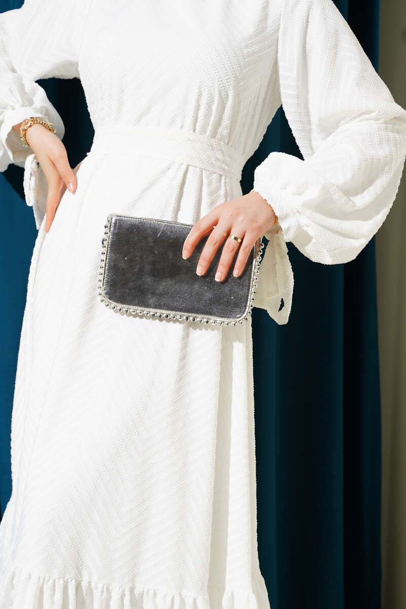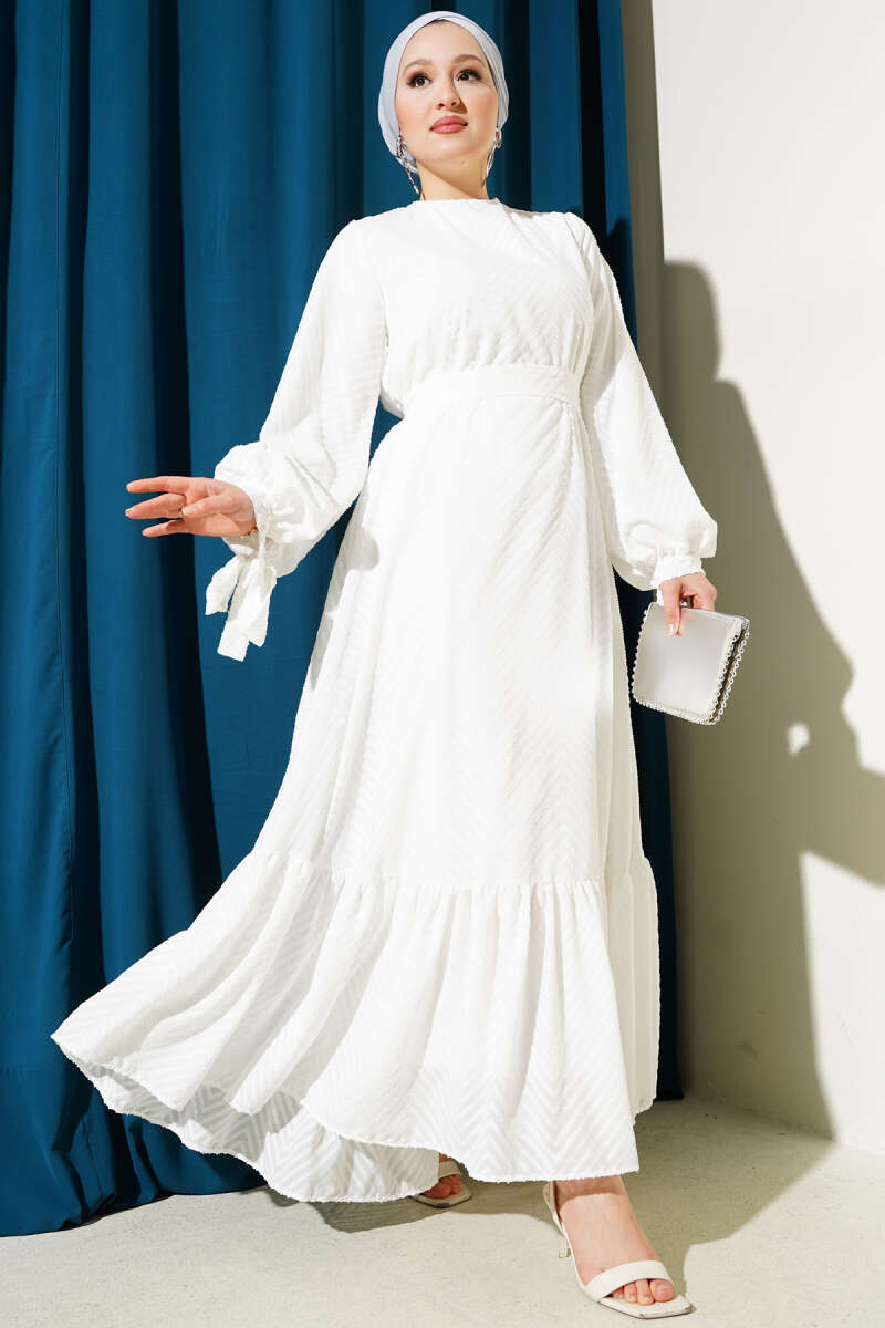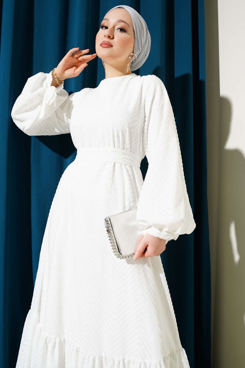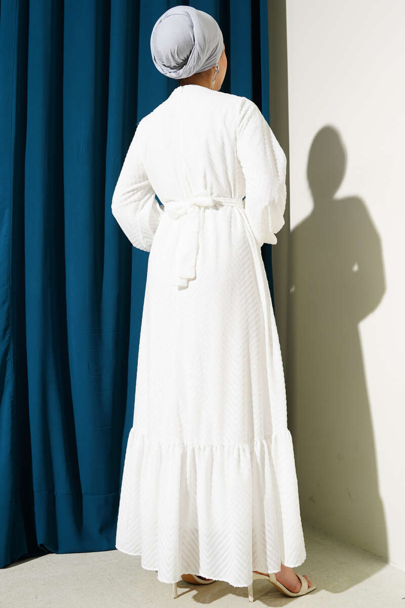 Kabartmalı Volanlı Kuşaklı Elbise Beyaz