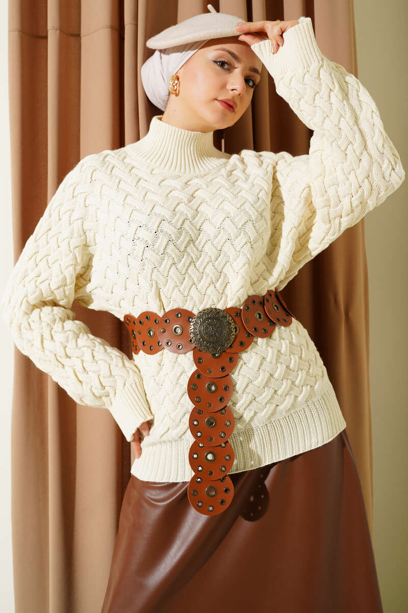 Örgülü Salaş Triko Kazak Yağ Yeşili