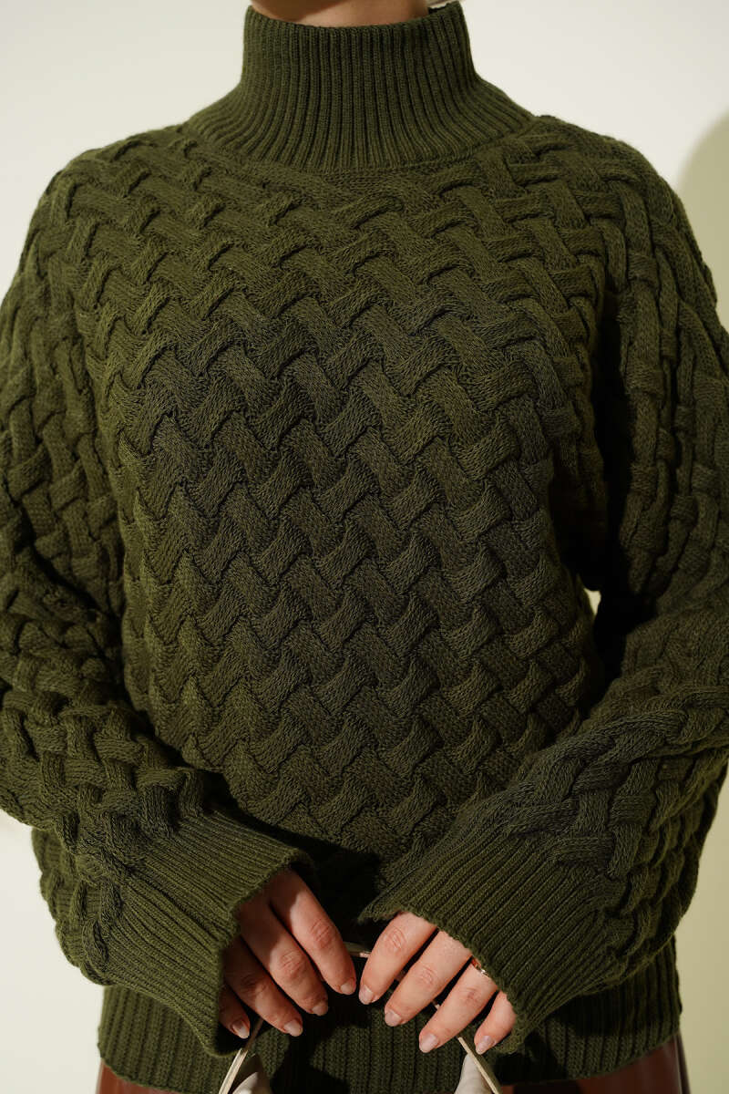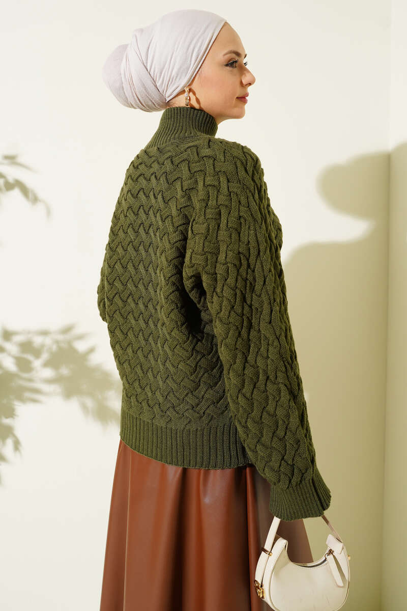 Kabartmalı Yarasa Kol Triko Kazak Yağ Yeşili