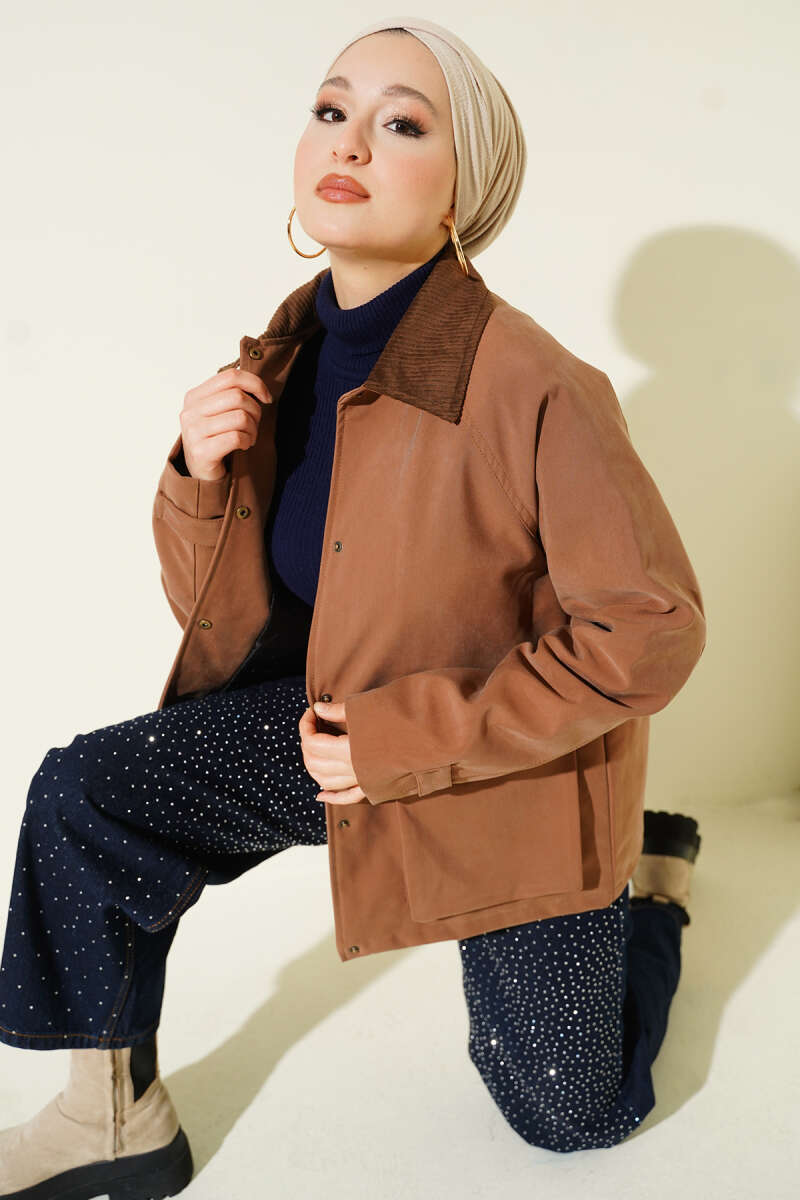 Kadife Gömlek Yaka Cepli Ceket Bej