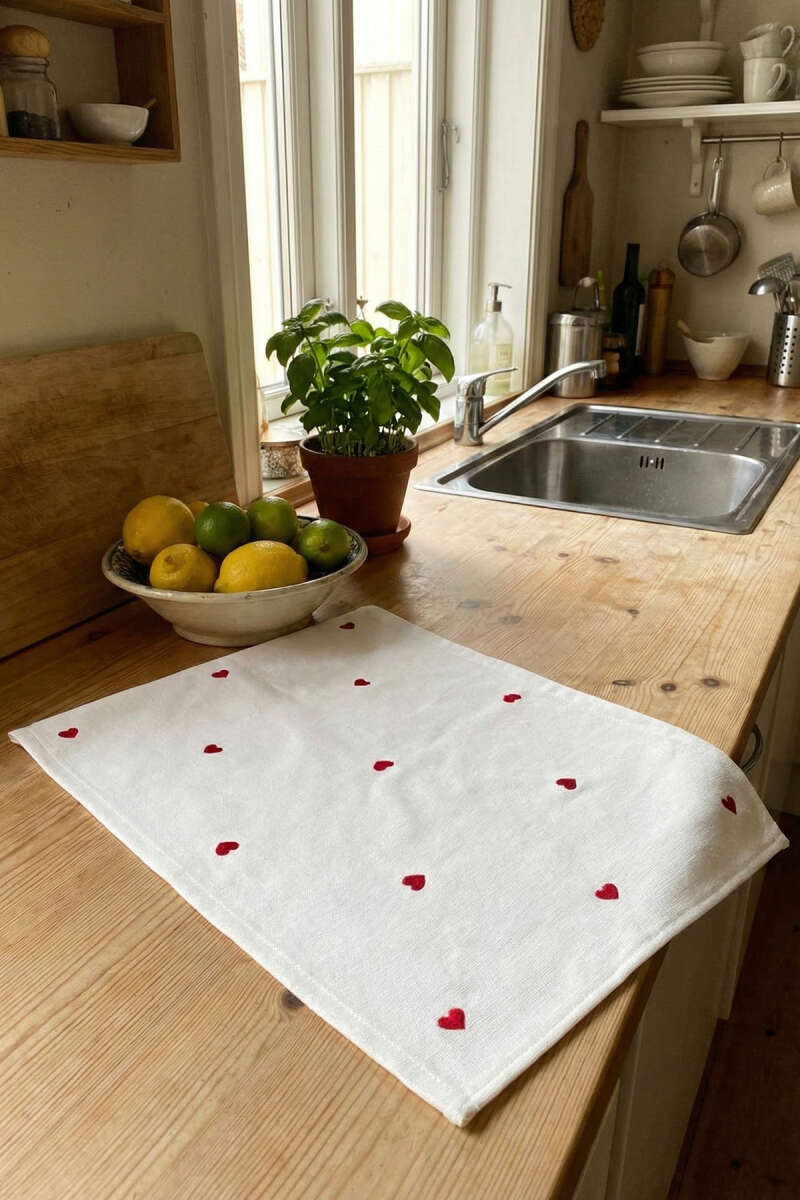 Kadife Kalp Nakışlı Mutfak Havlusu Beyaz