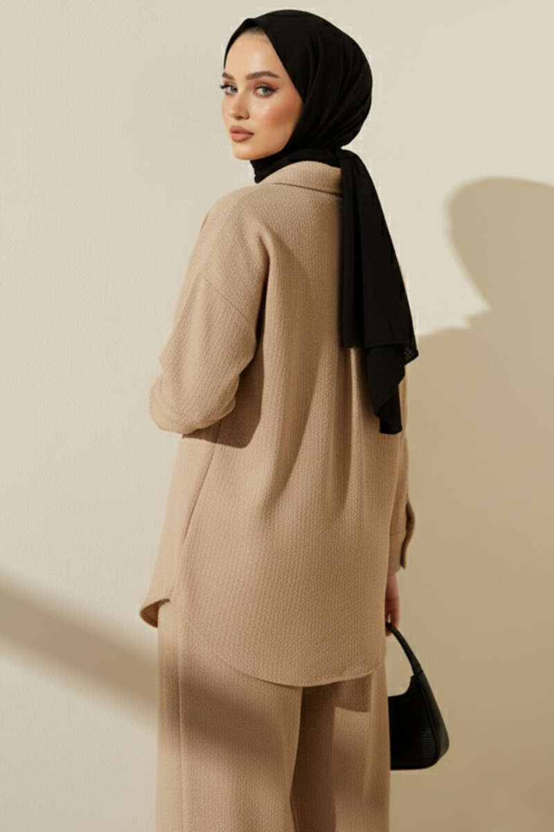 Dik Çizgili Uzun Keten Gömlek Pudra