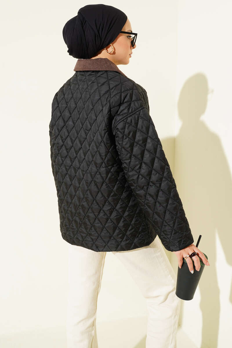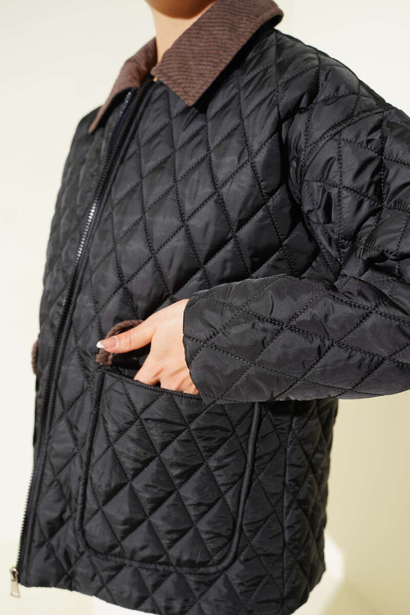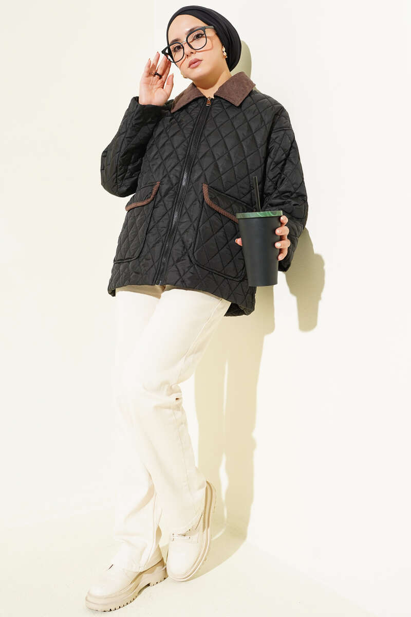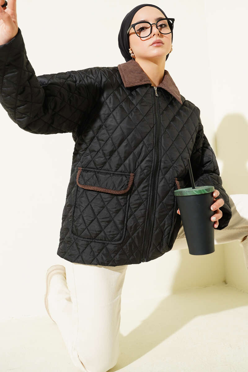 Kapitone Fermuarlı Kapüşonlu Mont Siyah