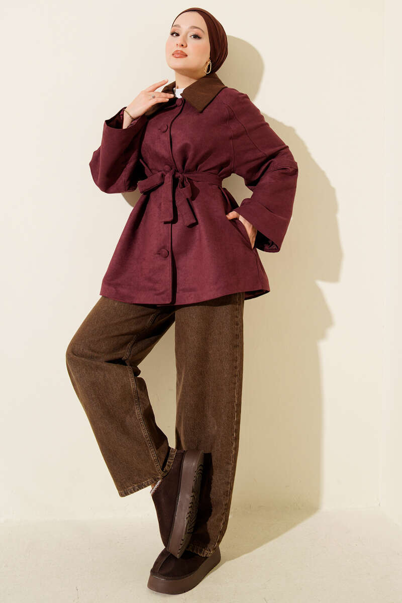 Düğmeli Kuşaklı Tay Tüyü Ceket Bordo