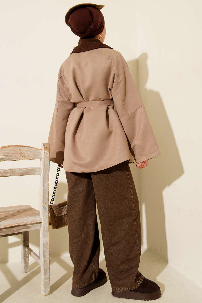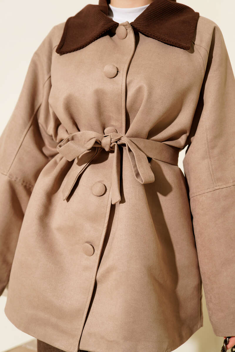 Kadife Yaka Süet Kuşaklı Ceket Taba