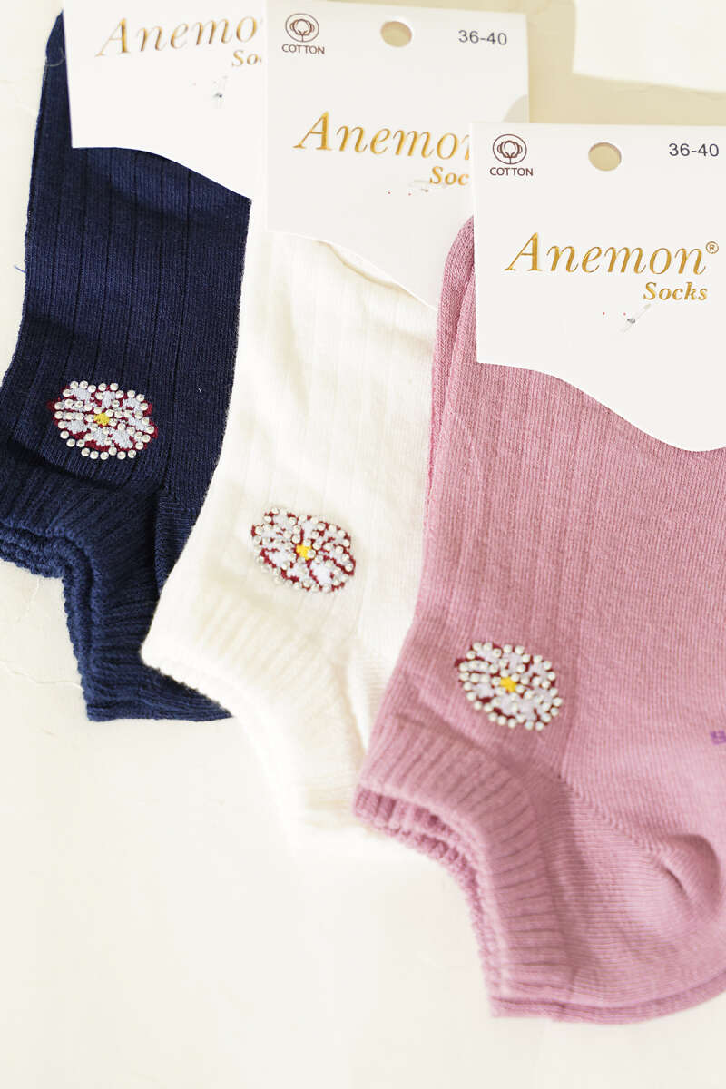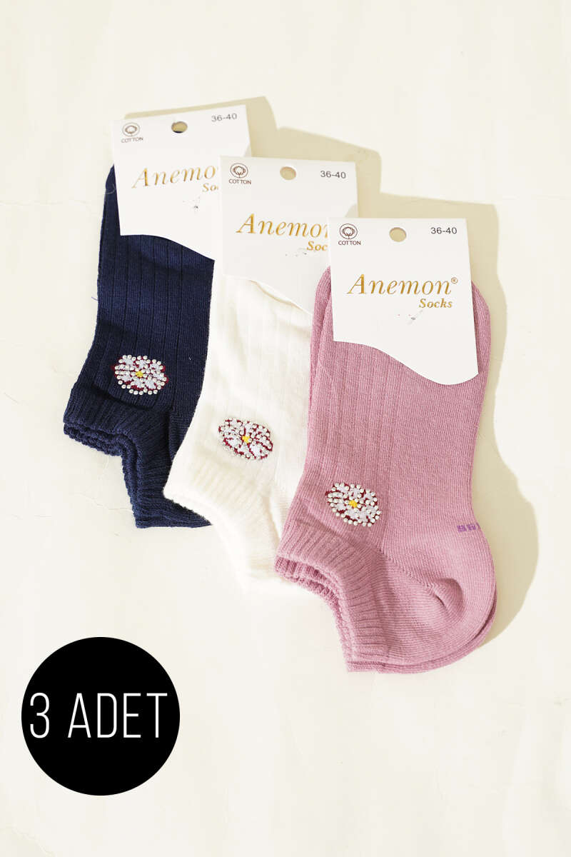 Kadın 3'lü Mini Taş Detaylı Patik Çorap Asorti 13