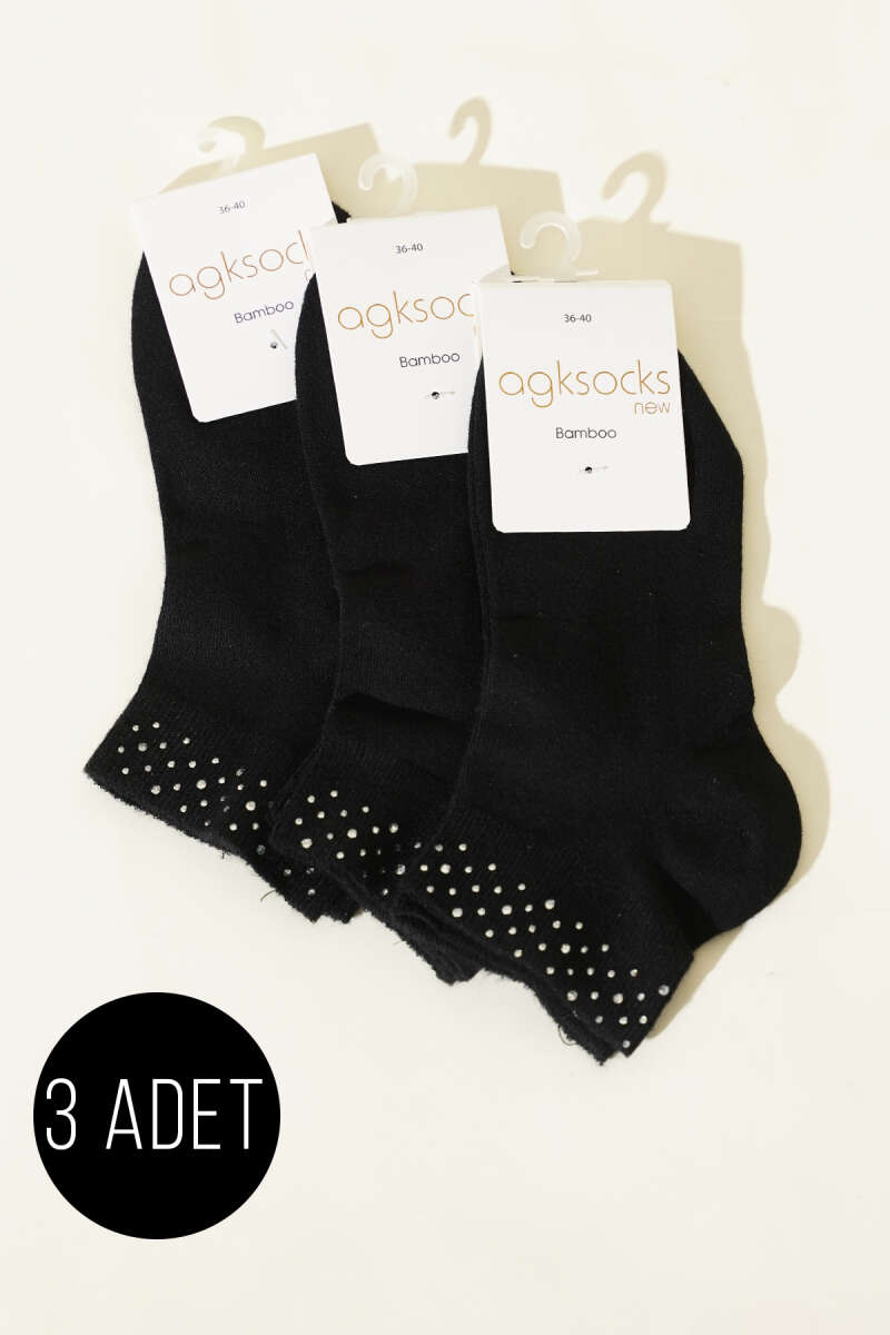 Kadın 3'lü Mini Taşlı Patik Çorap Siyah