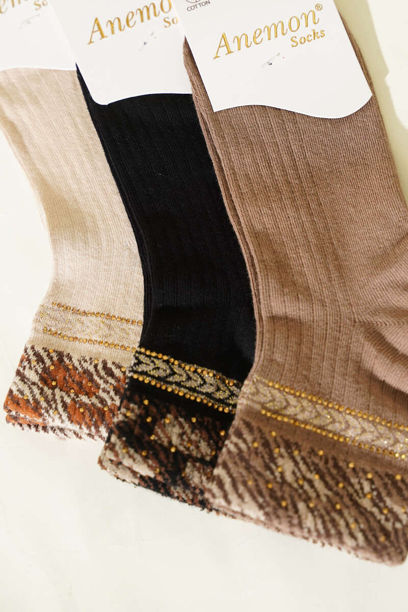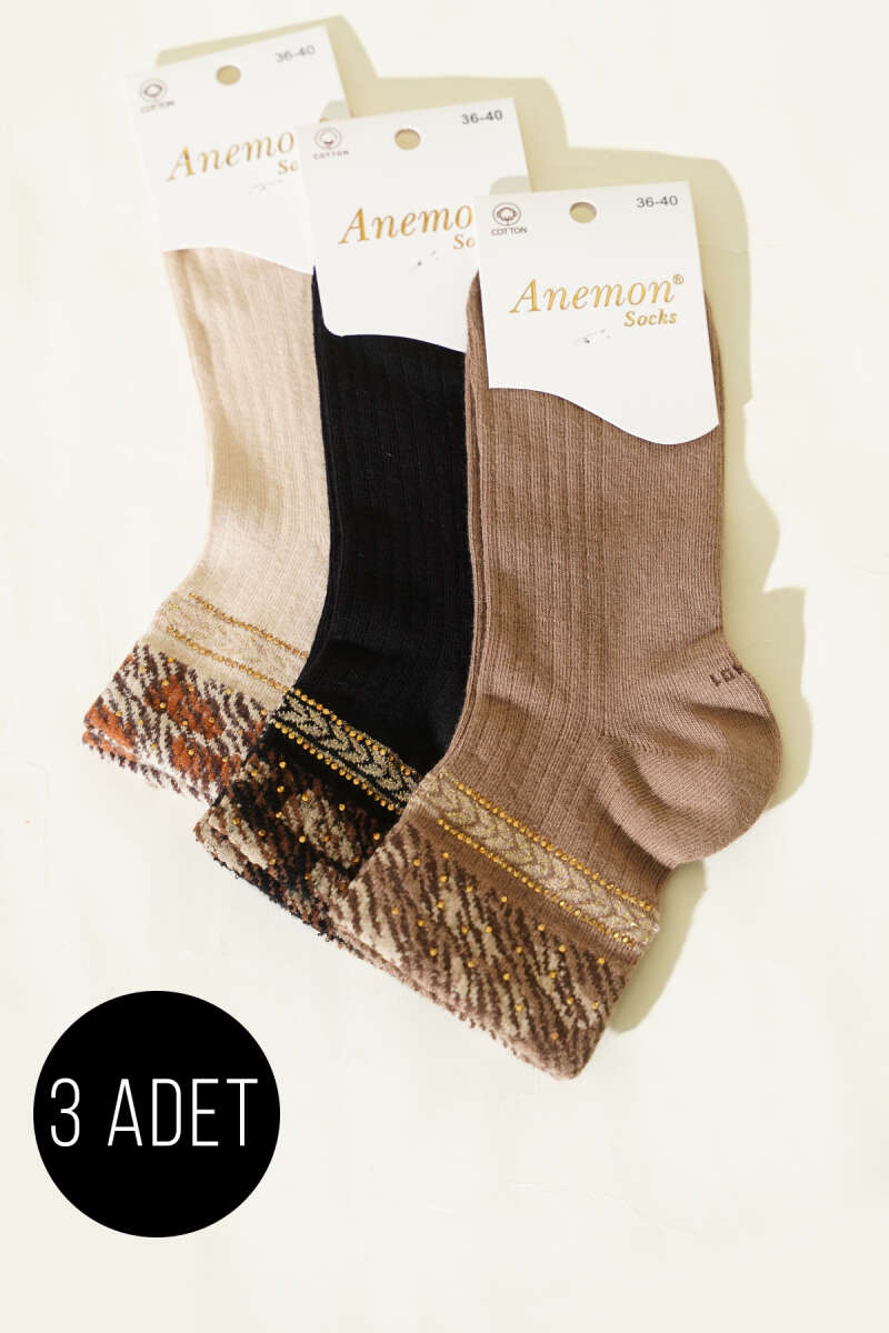 Kadın 3'lü Taş Detaylı Kısa Konç Çorap Asorti 12