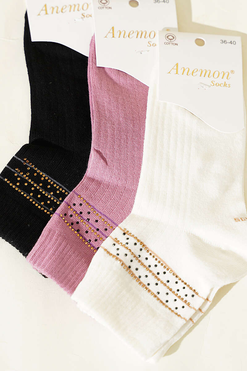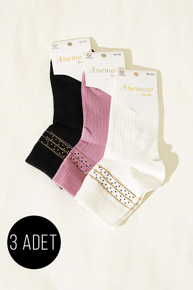 Kadın 3'lü Taş Detaylı Kısa Konç Çorap Asorti 15