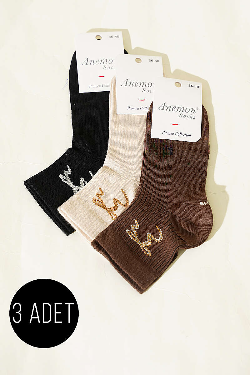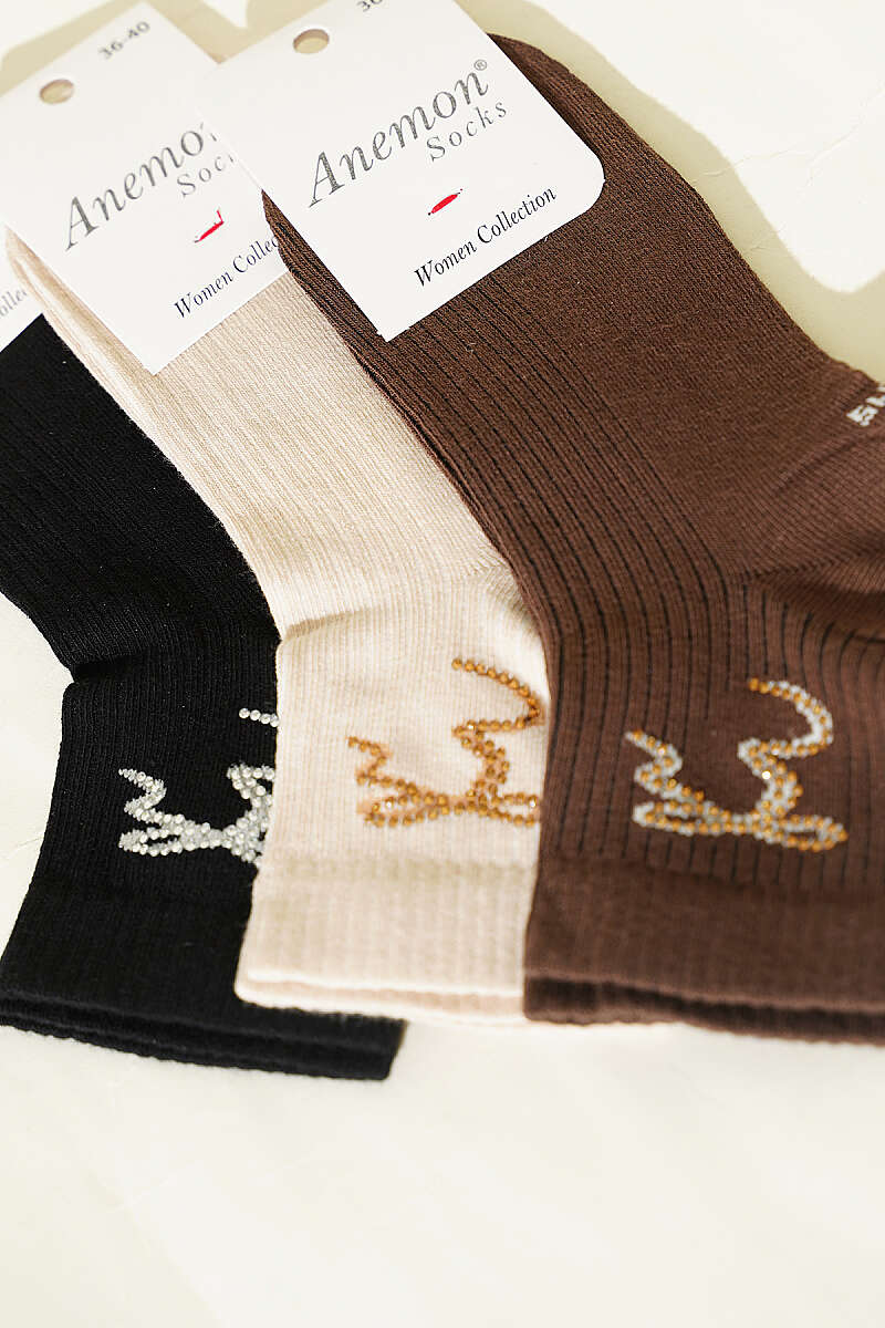 Kadın 3'lü Taş Detaylı Kısa Konç Çorap Asorti 25