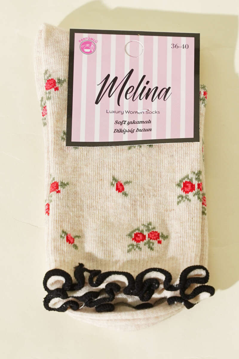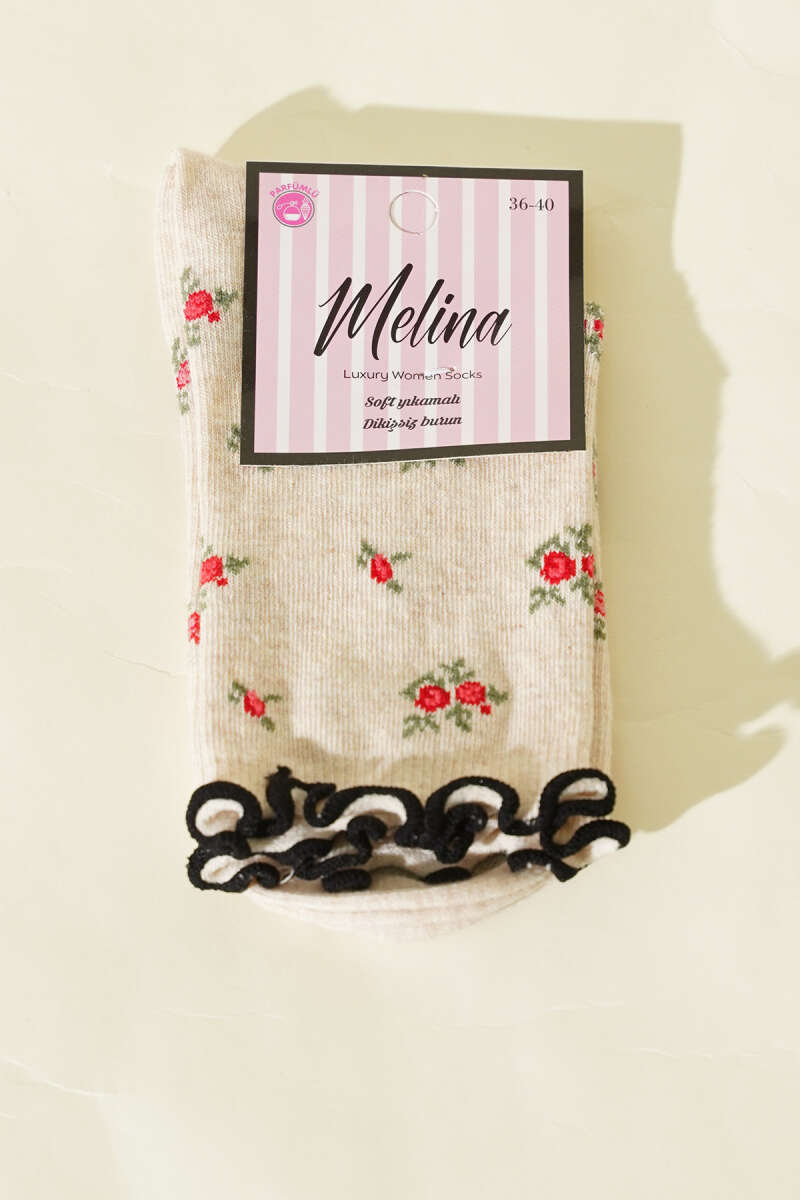 Kadın Çiçekli Fırfırlı Soket Çorap Bej