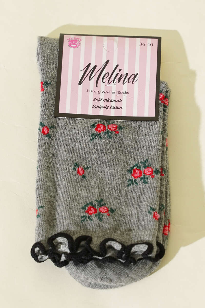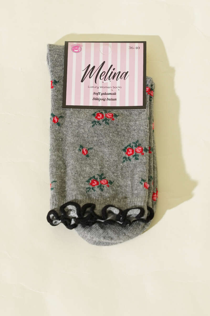 Kadın Çiçekli Fırfırlı Soket Çorap Gri