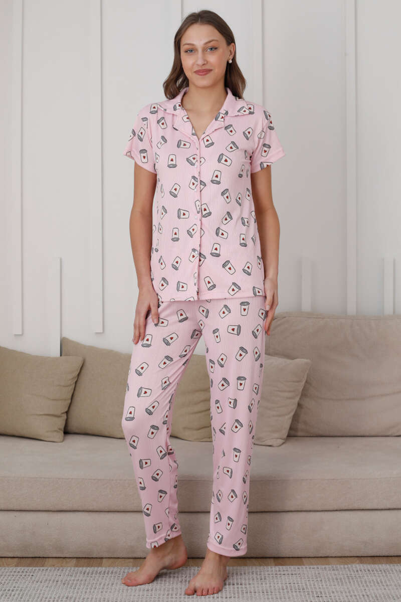 Kahve Bardağı Desen Düğmeli Pijama Takımı Pembe