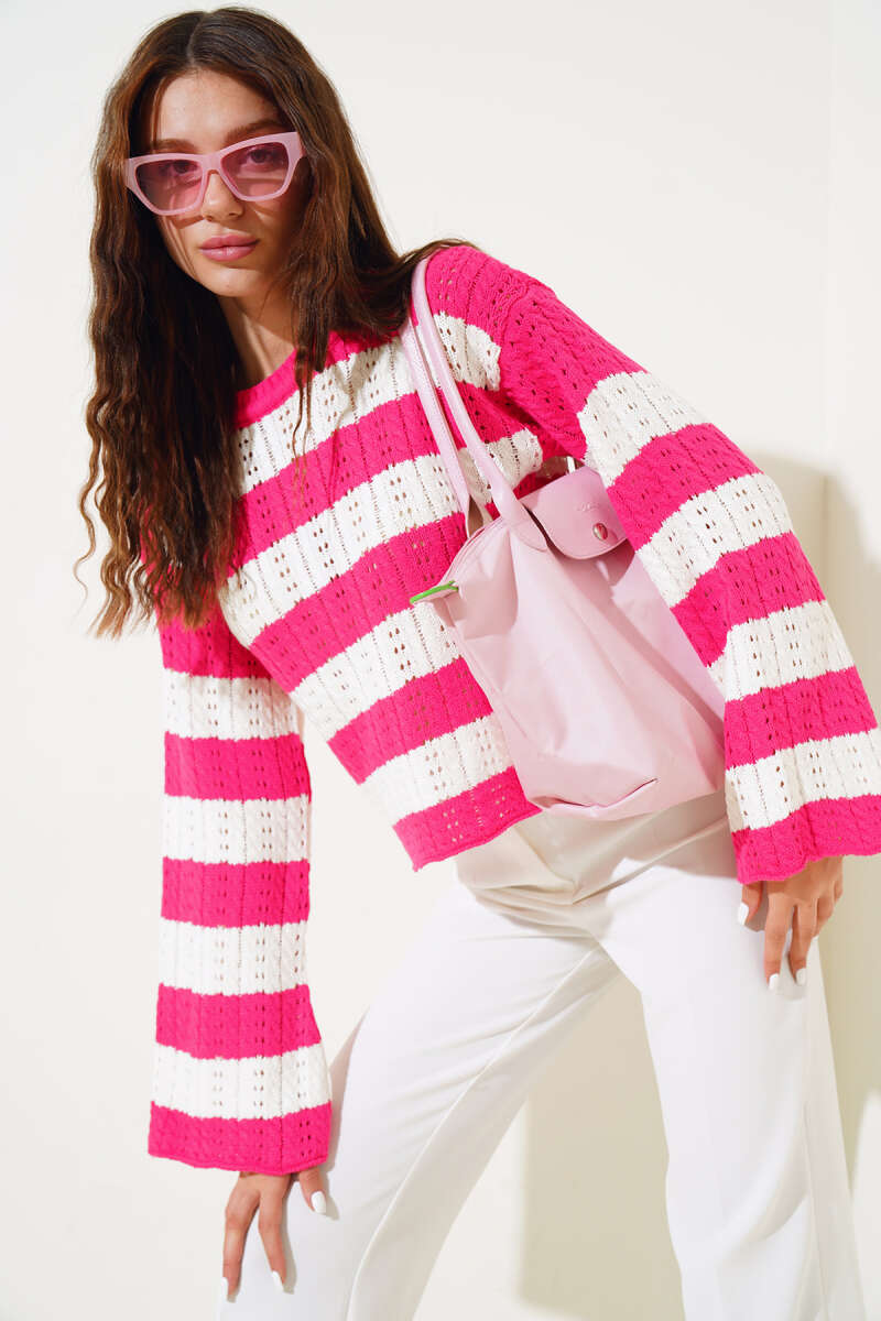 Kalın Çizgili Delikli Triko Kazak Fuşya