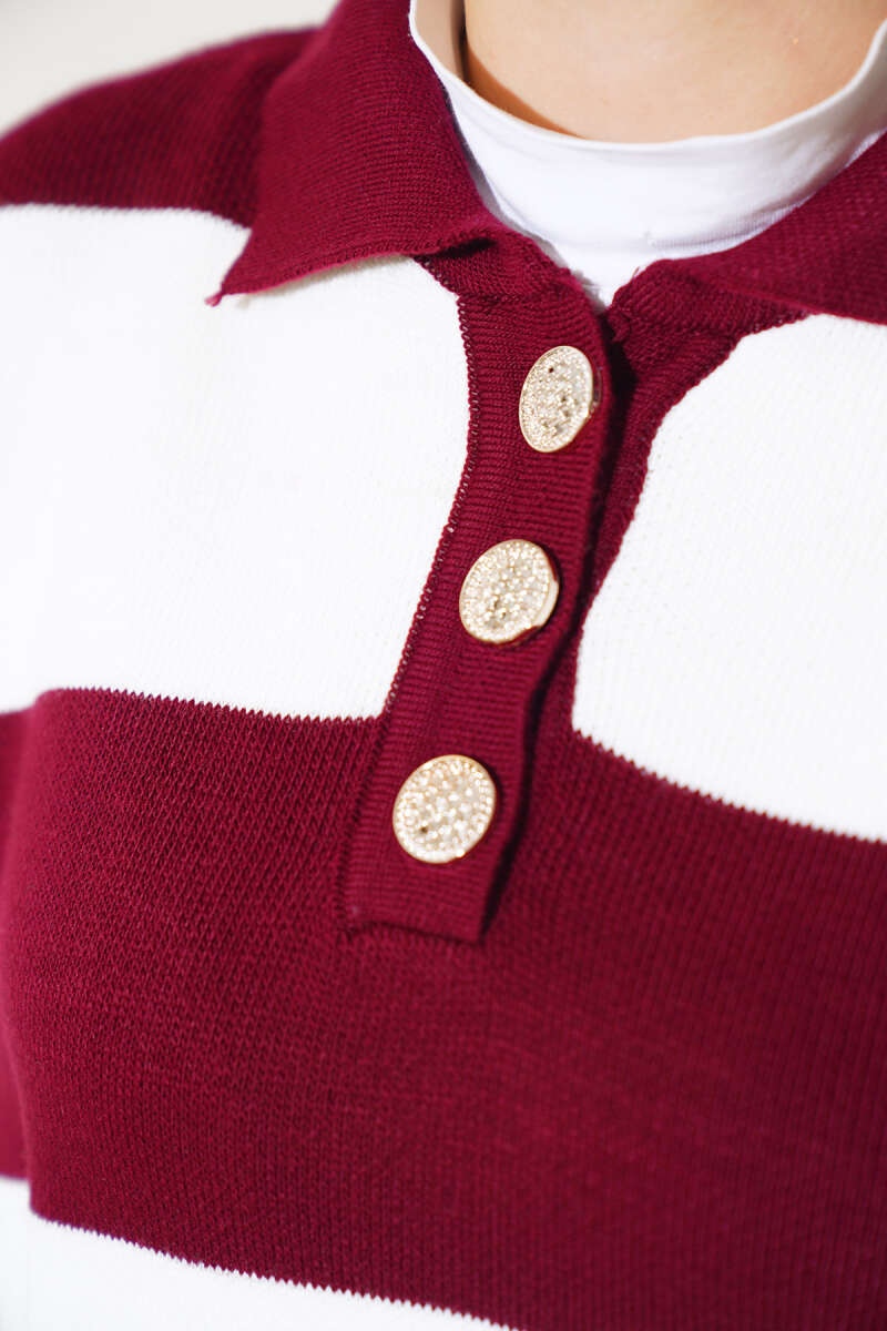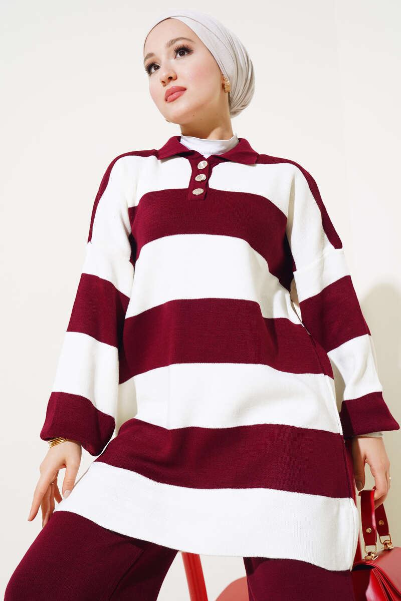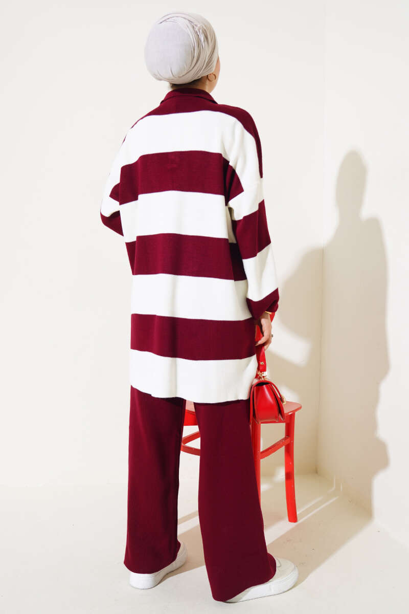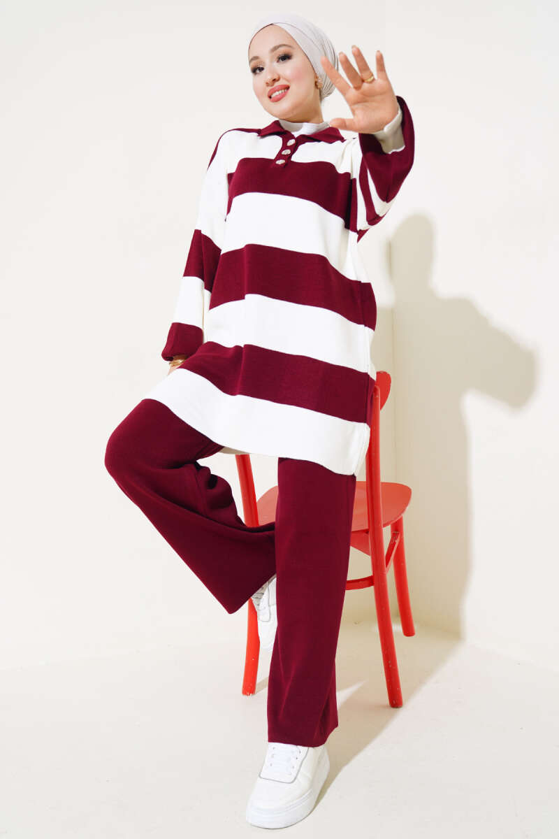 Fitilli Yatay Çizgili Triko İkili Takım Bordo