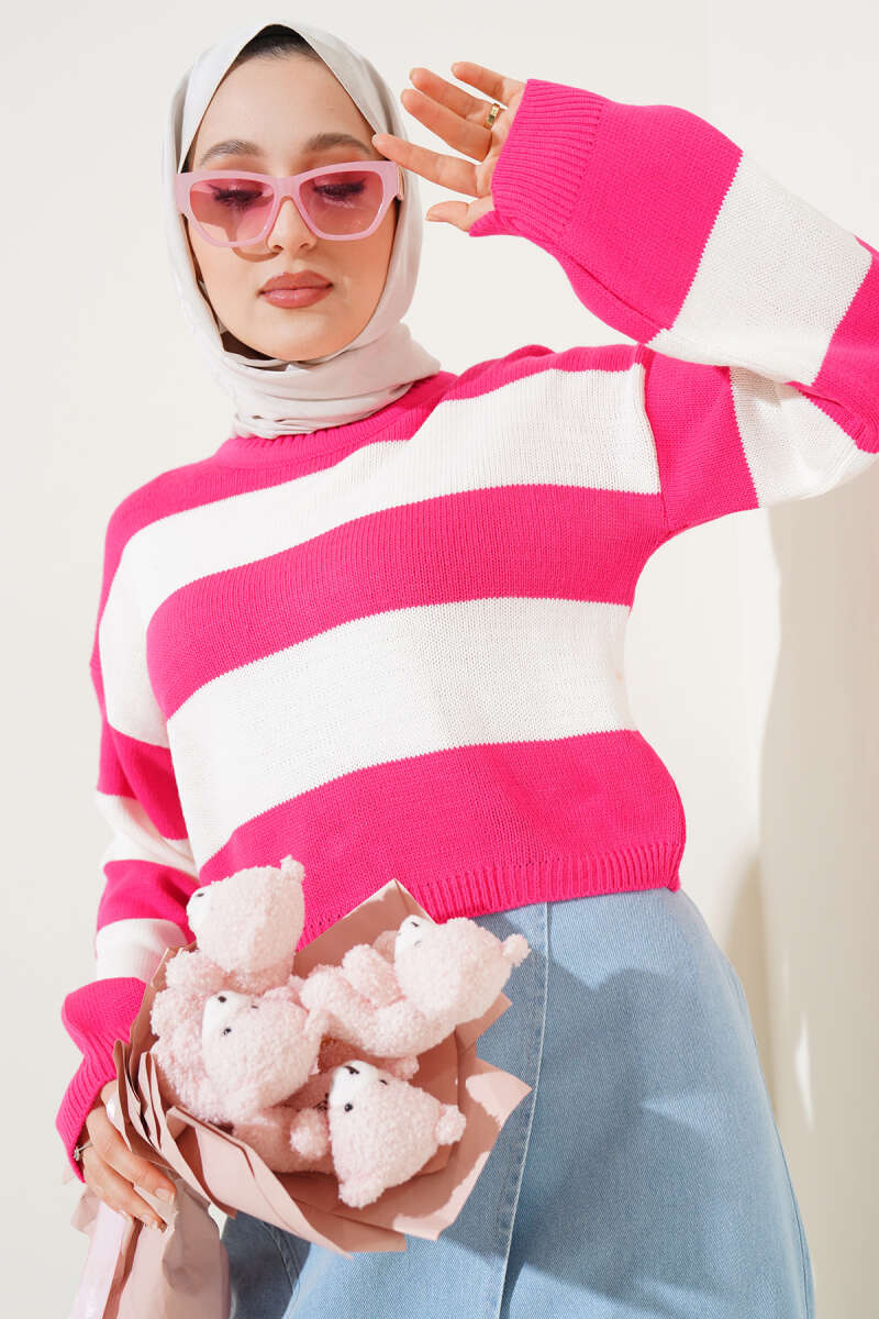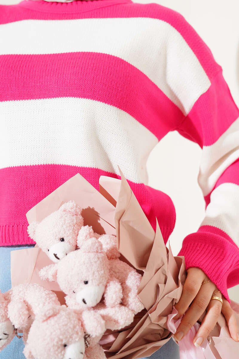 Kalın Çizgili Triko Crop Kazak Fuşya