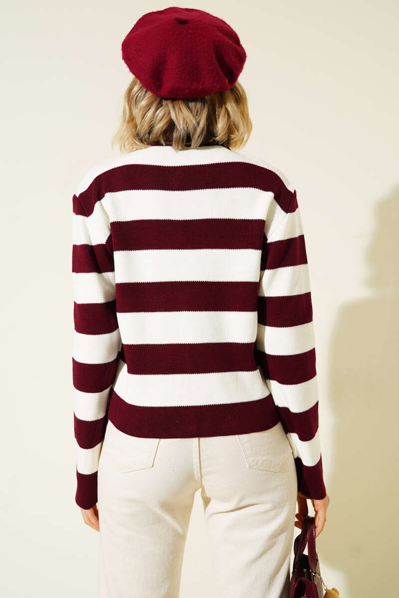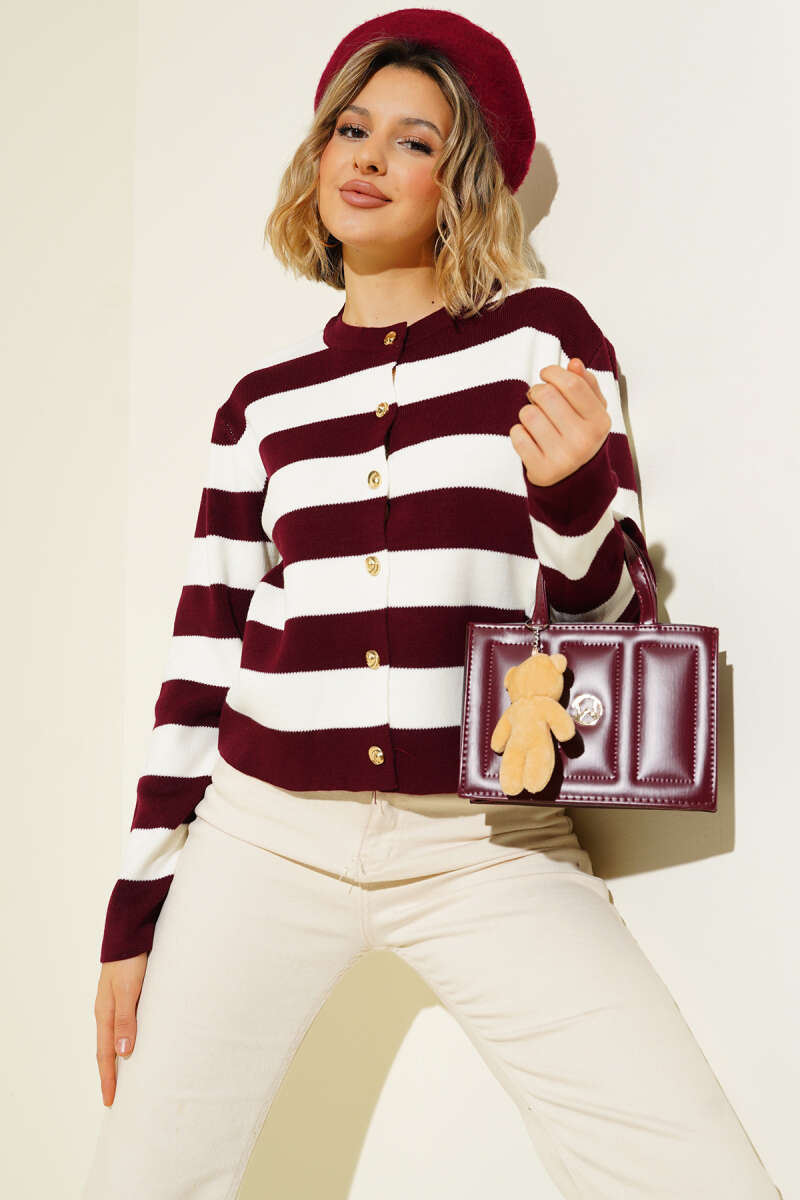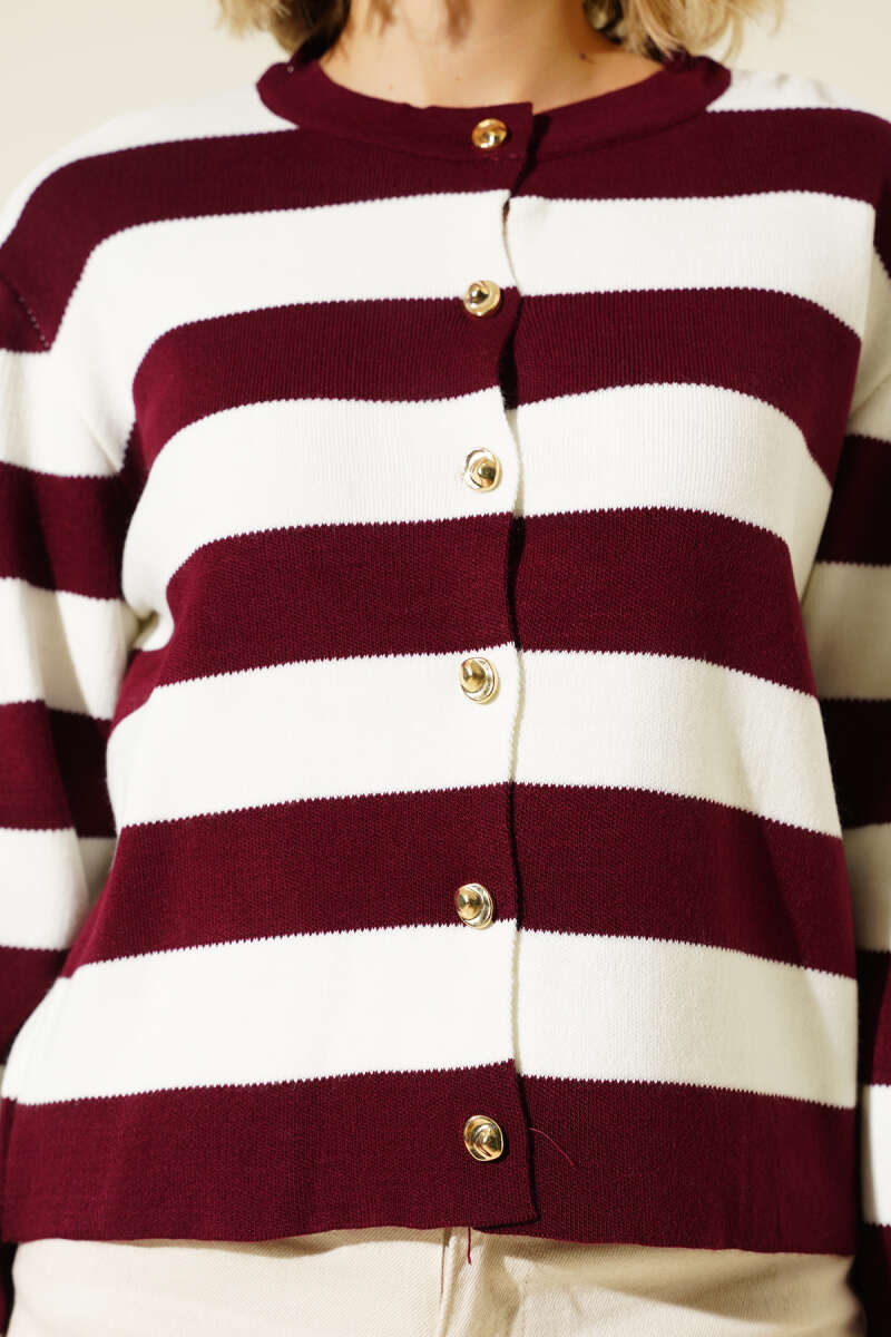 Kalın Çizgili Triko Hırka Bordo Ekru