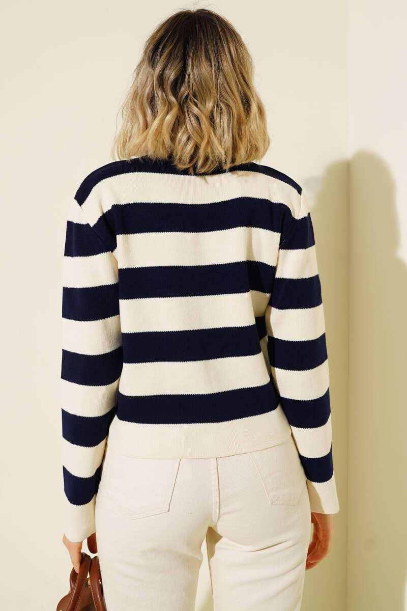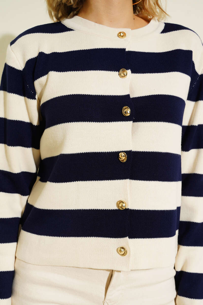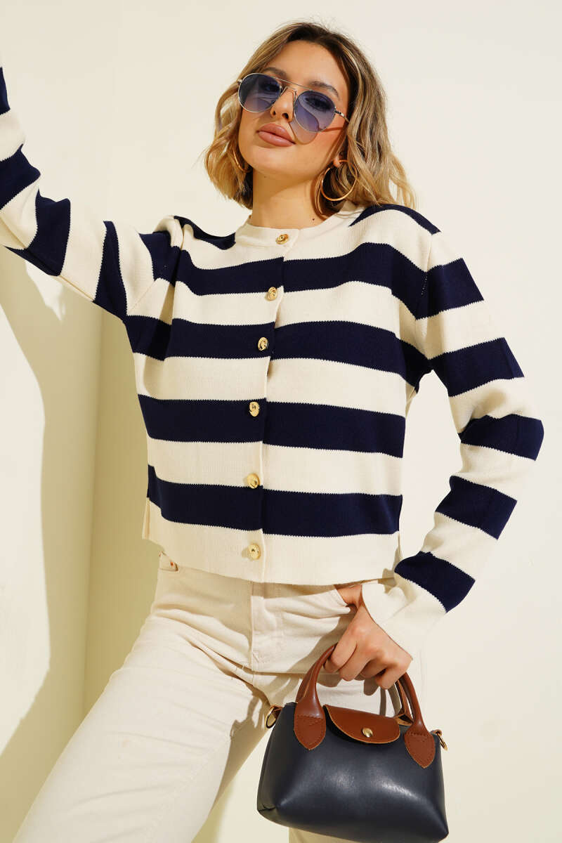 Kalın Çizgili Triko Hırka Lacivert Ekru