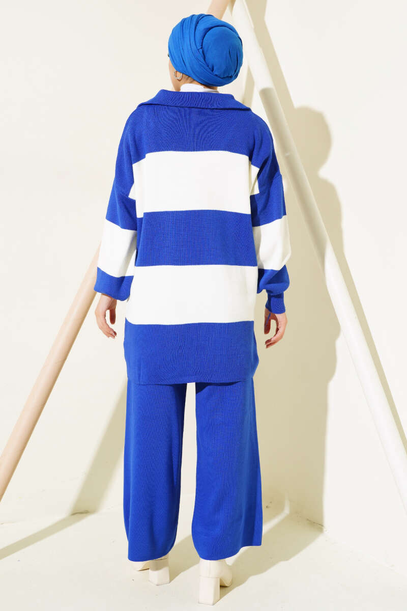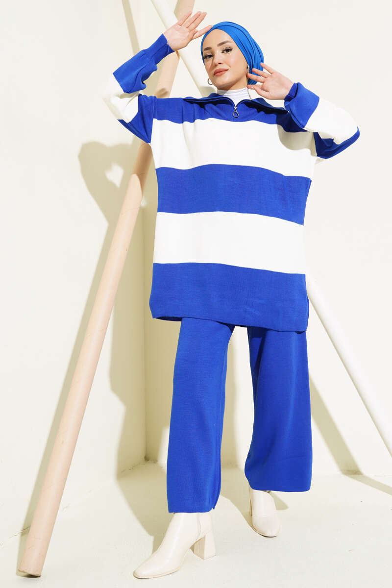 Kalın Çizgili Yarım Fermuarlı Triko Takım Saks