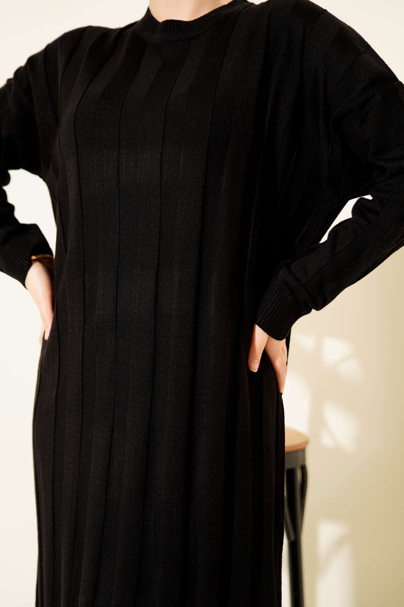 Kalın Dik Şeritli Triko Elbise Kahve