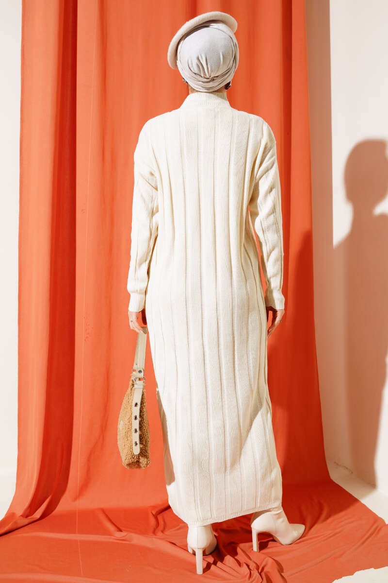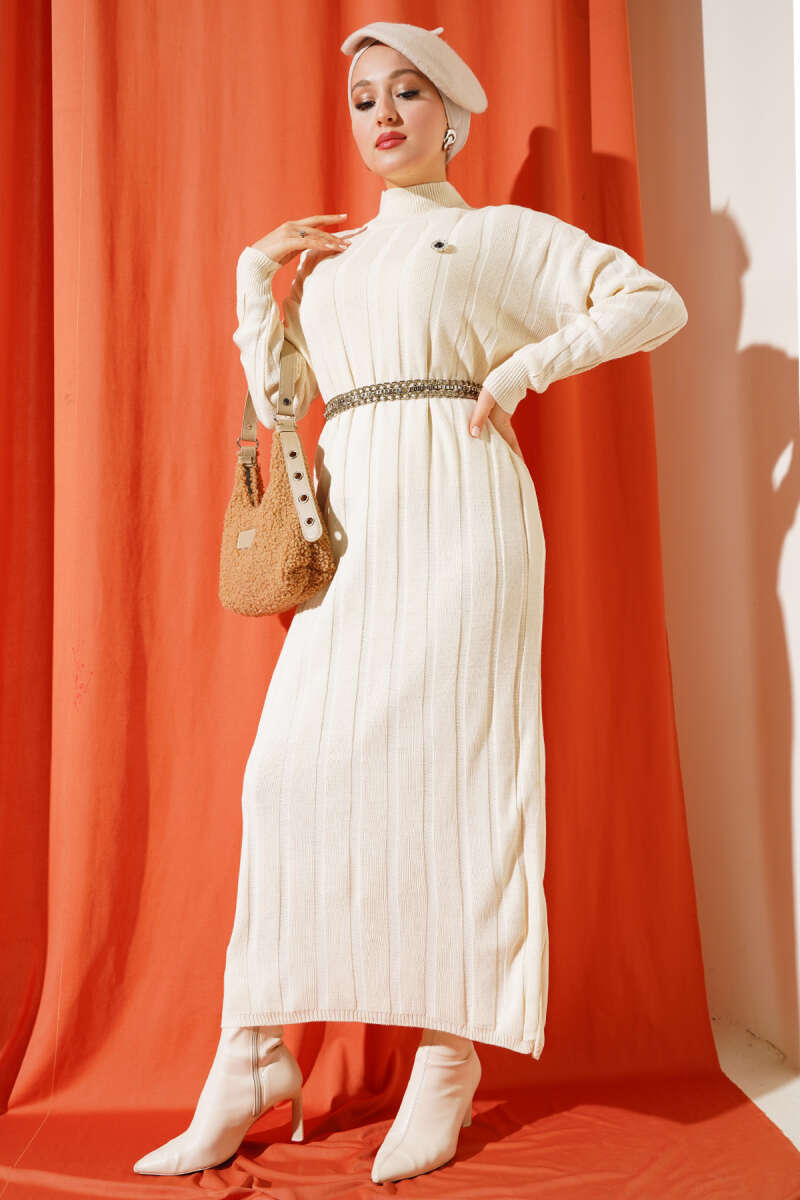 Kalın Fitilli Triko Elbise Bej
