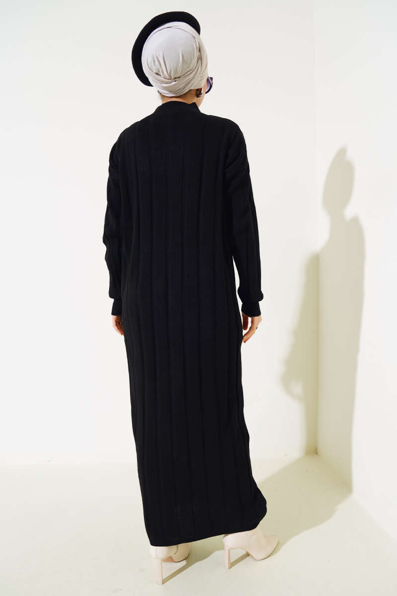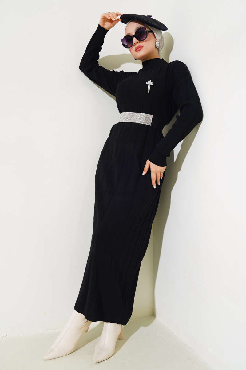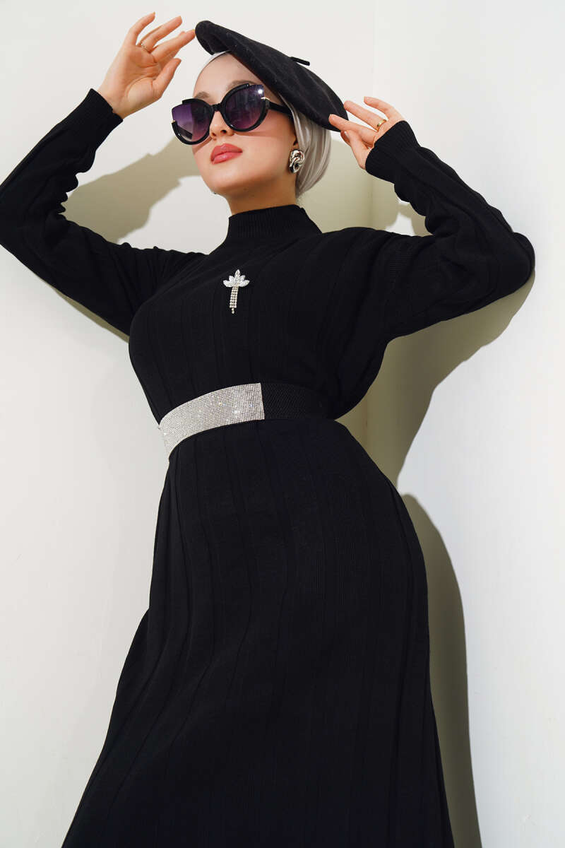 Kuşaklı Dik Fitilli Kaşe Elbise Siyah
