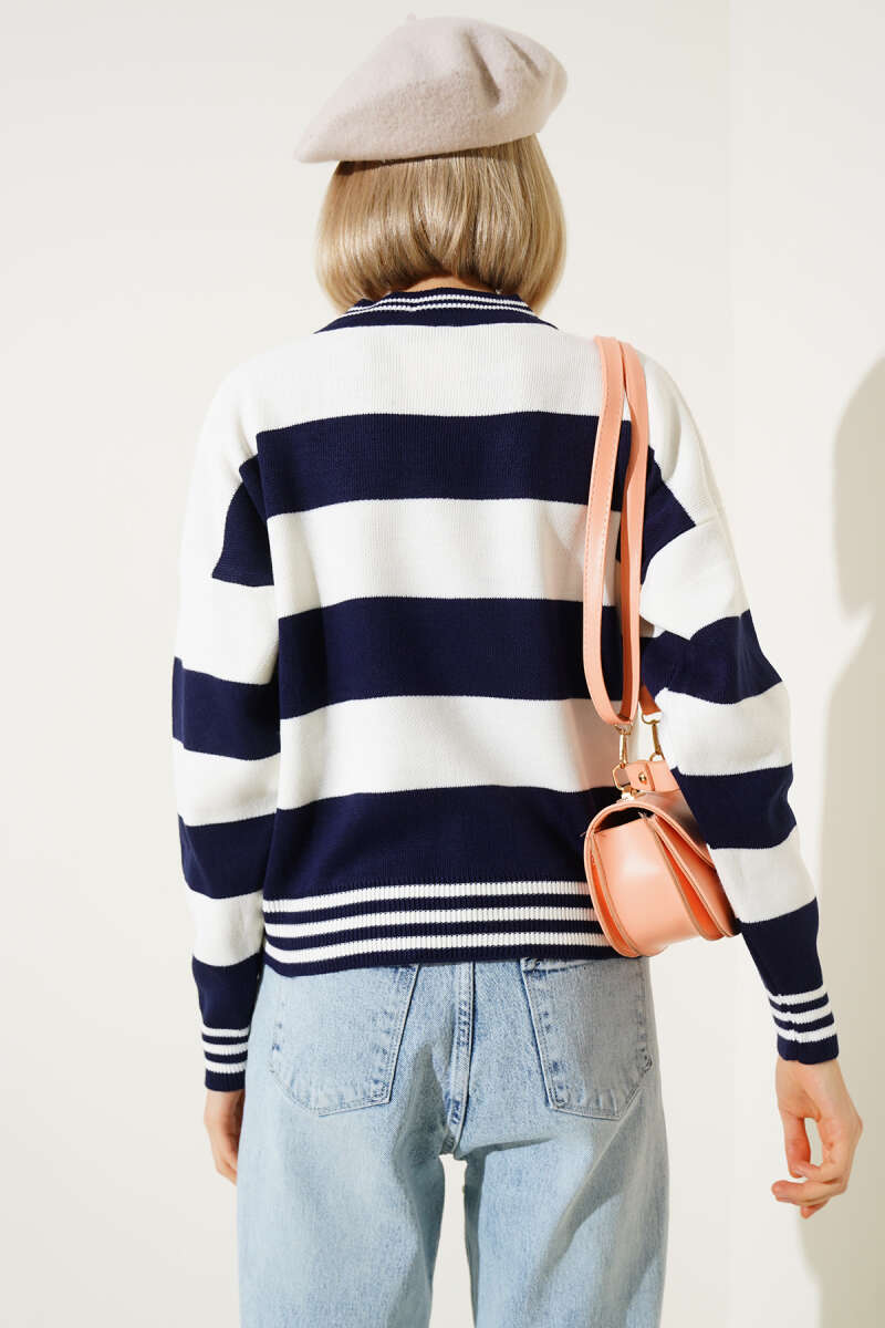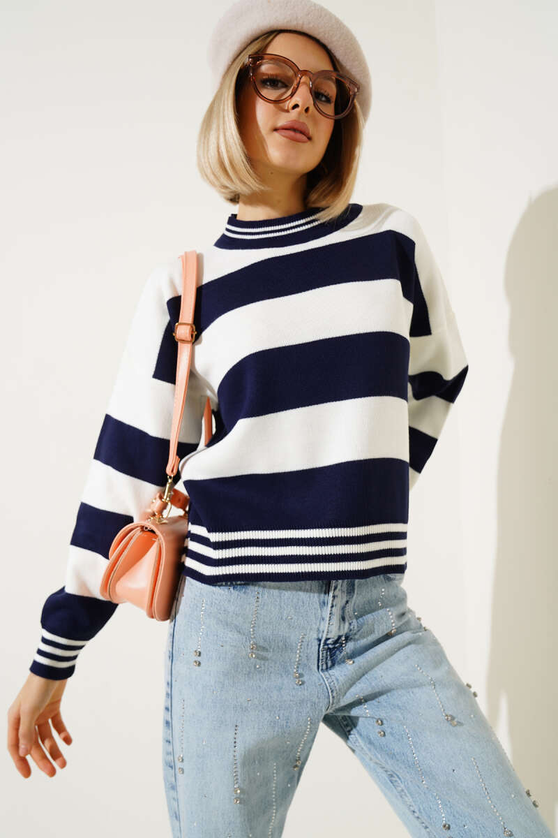 Kalın Yatay Çizgili Triko Crop Kazak Lacivert