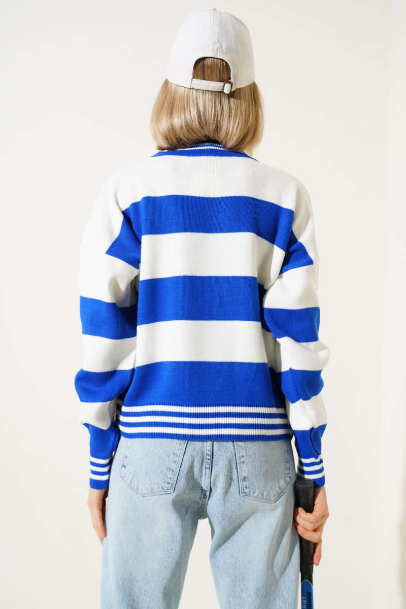 Kalın Yatay Çizgili Triko Crop Kazak Saks