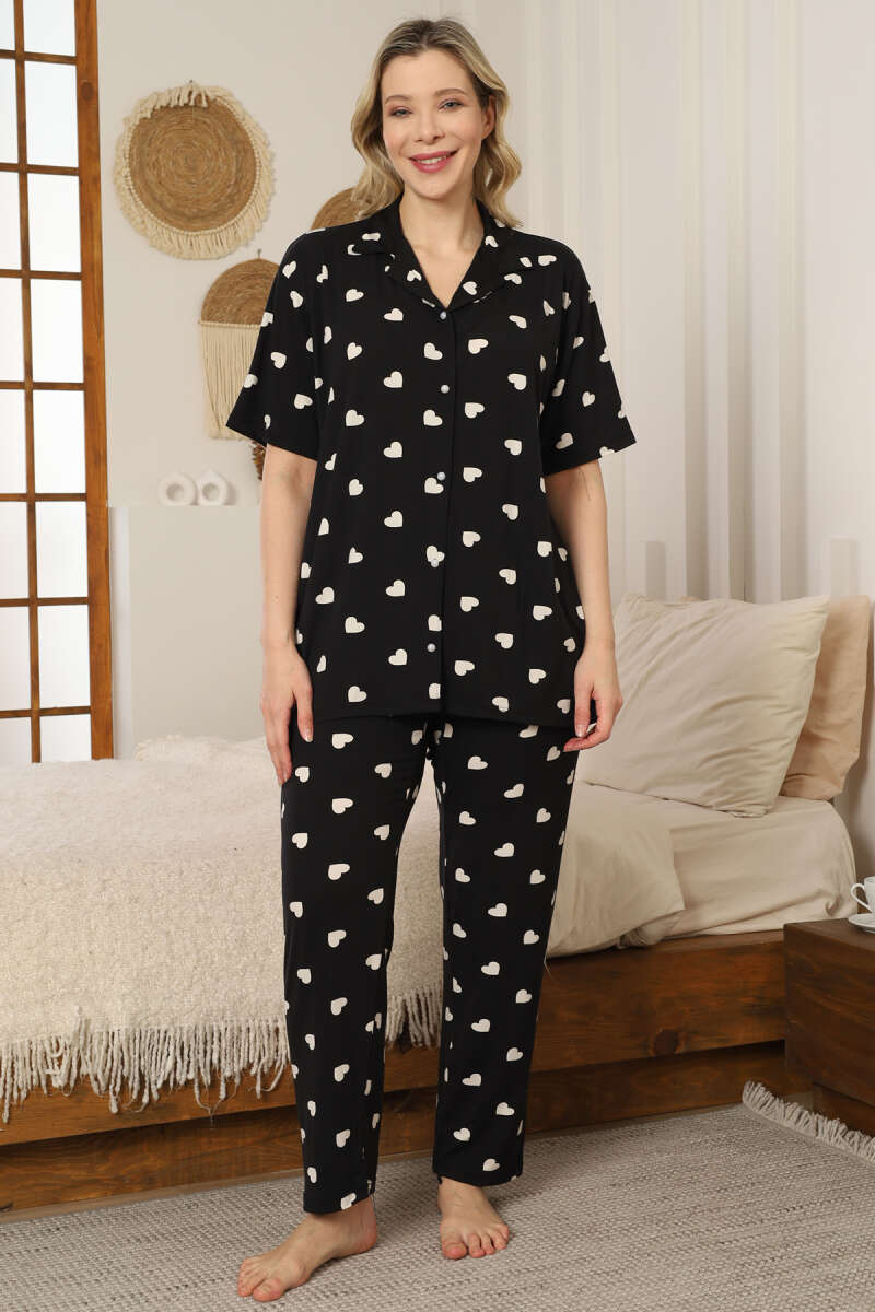 Kalp Desenli Büyük Beden Pijama Takımı Siyah