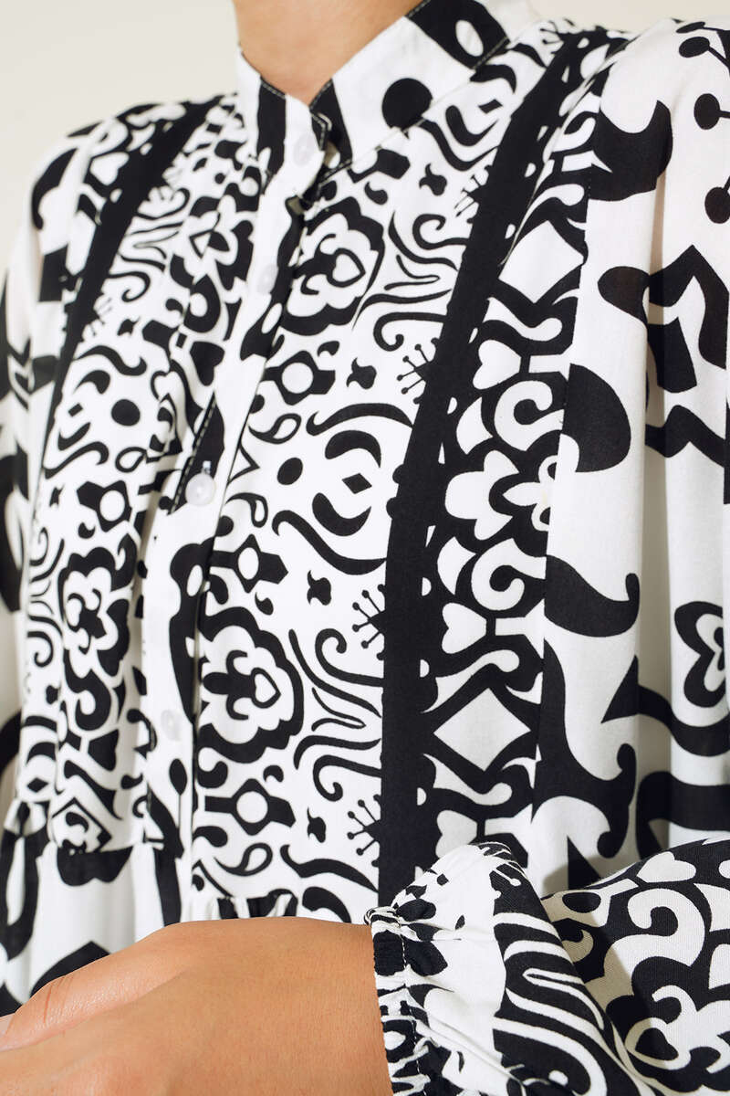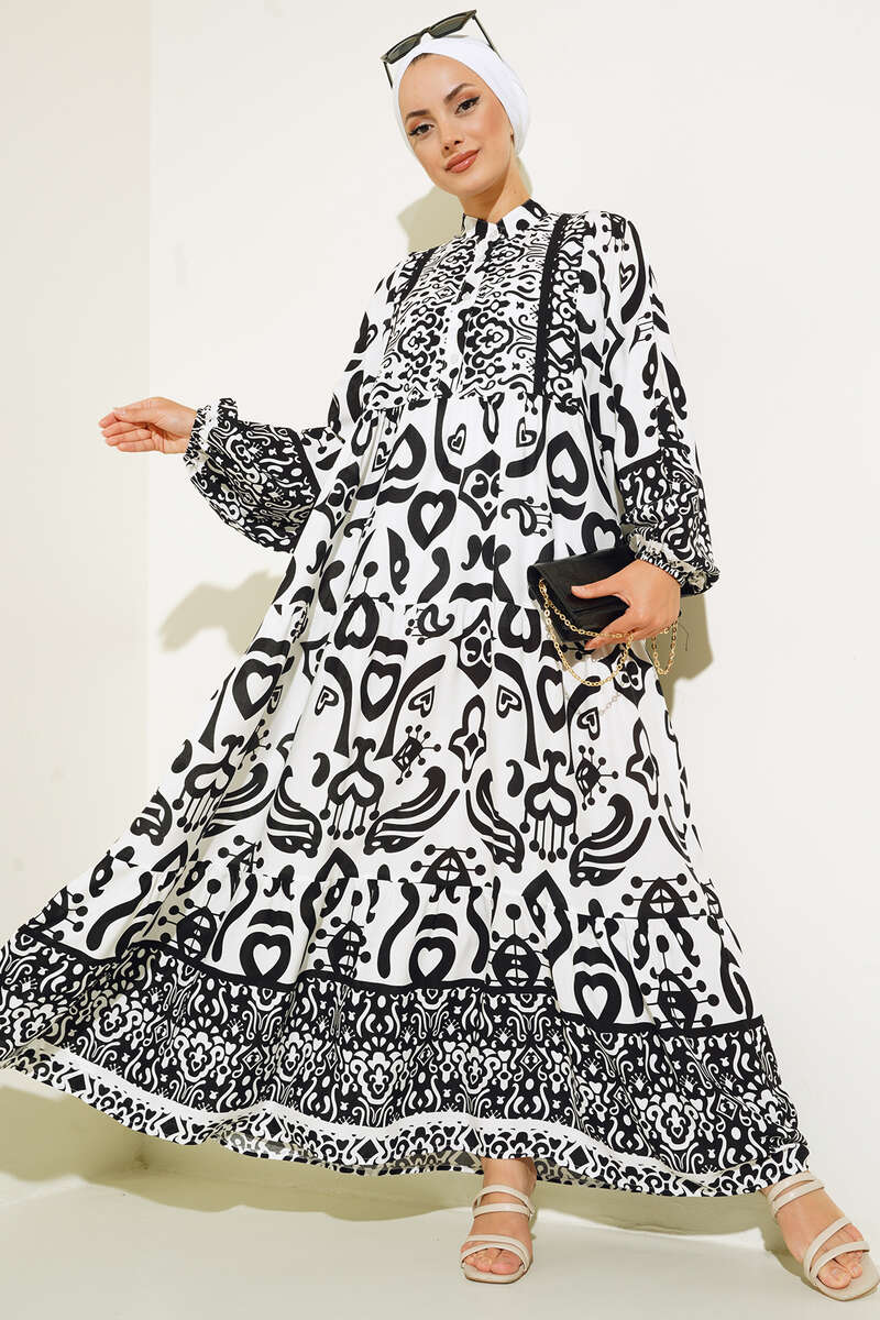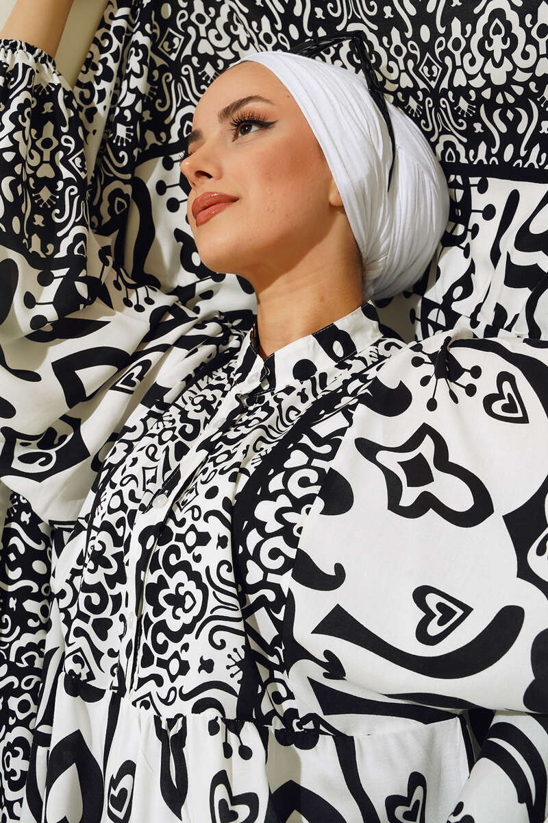 Yeni sezon kalp desenli elbisemiz canlı renkleri ve enerjik desenleriyle tek parçada harika bir kombin yapmanıza olanak sağlayacaktır. Hakim yaka elbisemizin yakasına düğmeleri eşlik etmektedir.