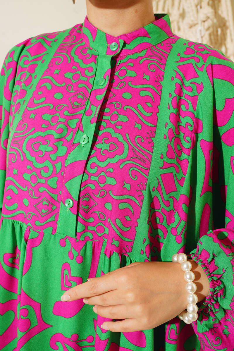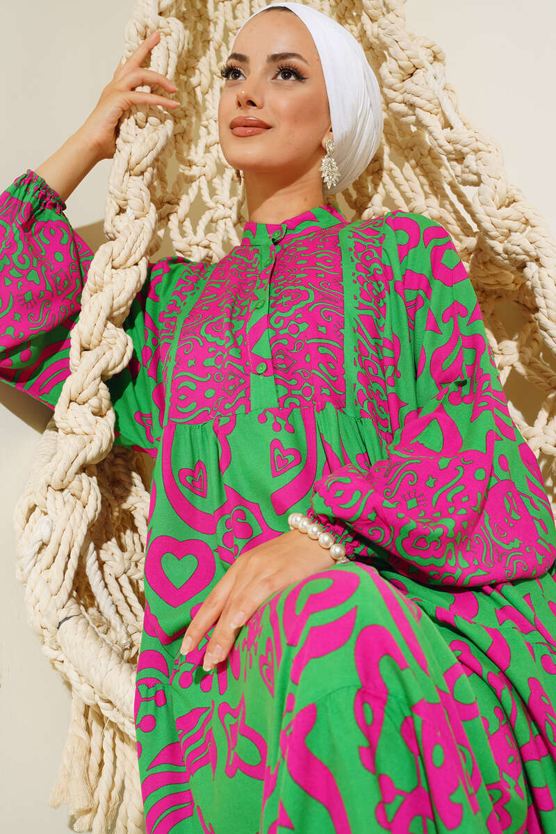 Yeni sezon kalp desenli elbisemiz canlı renkleri ve enerjik desenleriyle tek parçada harika bir kombin yapmanıza olanak sağlayacaktır. Hakim yaka elbisemizin yakasına düğmeleri eşlik etmektedir.