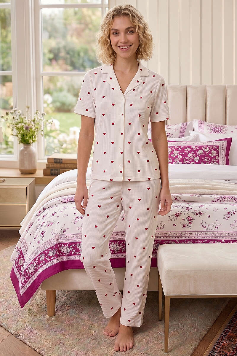 Kalp Desenli Fitilli Pijama Takımı Beyaz