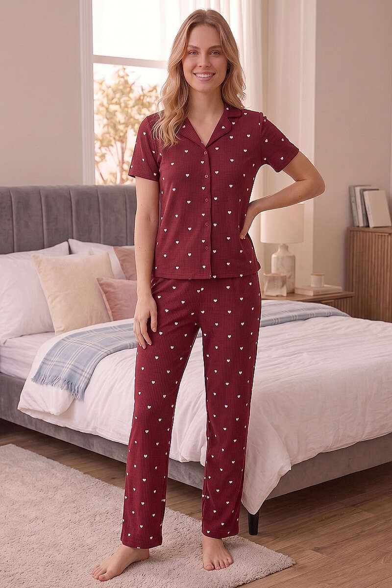 Kalp Desenli Fitilli Pijama Takımı Bordo
