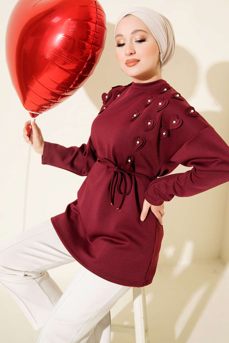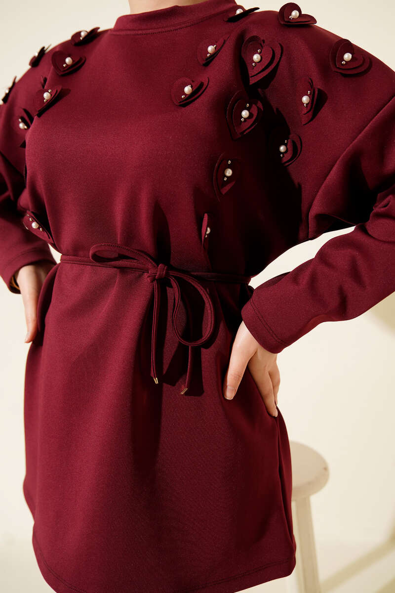 Kalp Desenli İnci Detaylı Tunik Kahve