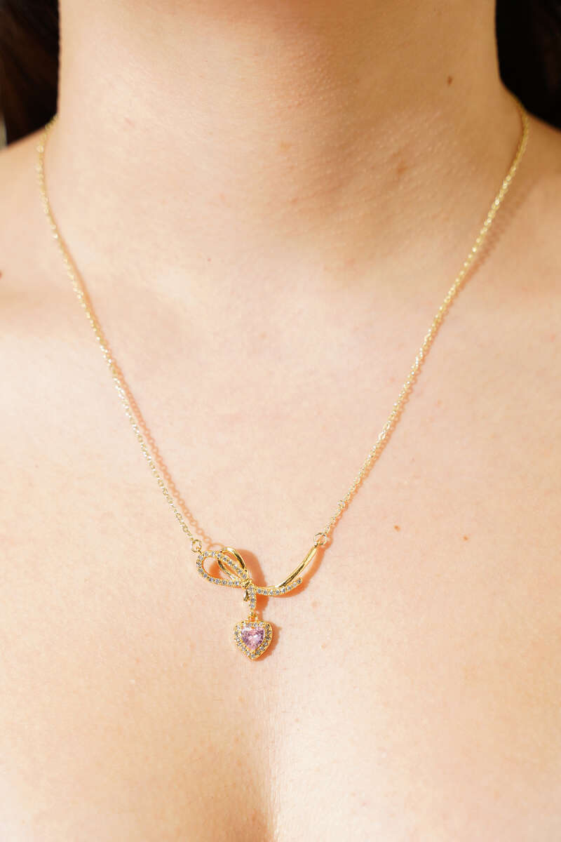 Romantik Gül Motifli Pembe Taş Kolye Gold