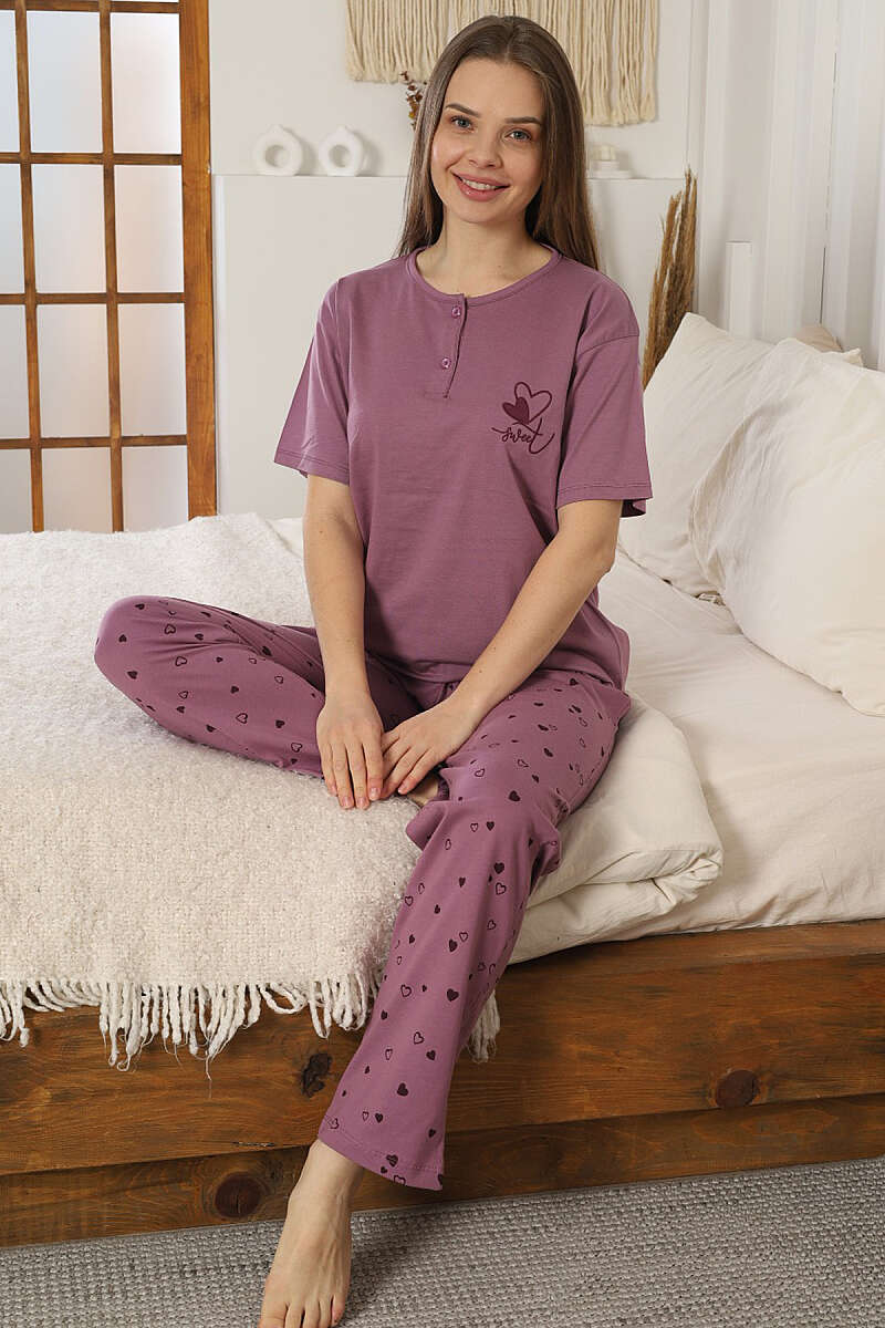 Kalp Nakış Detaylı Kısa Kol Pijama Takımı Magenta