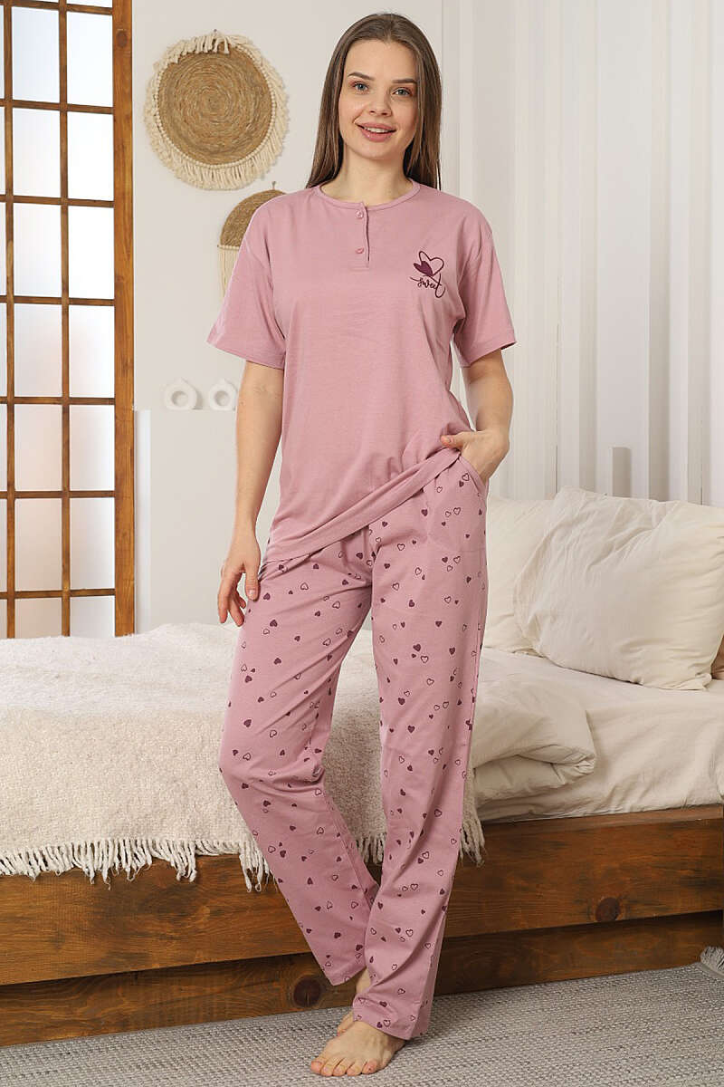 Kalp Nakış Detaylı Kısa Kol Pijama Takımı Pudra