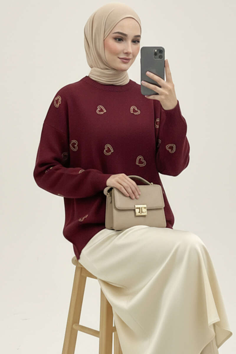 Küçük Kalp Nakışlı Triko Kazak Bordo