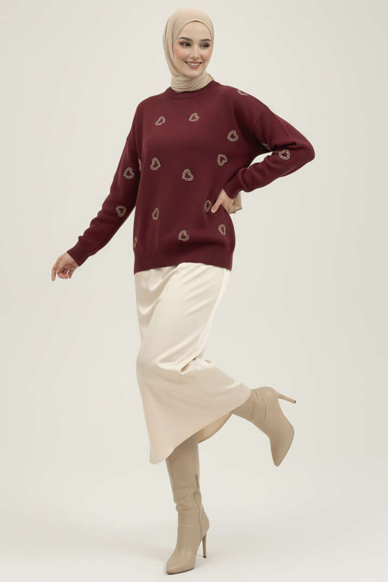 Kalp Nakışlı Triko Kazak Bordo
