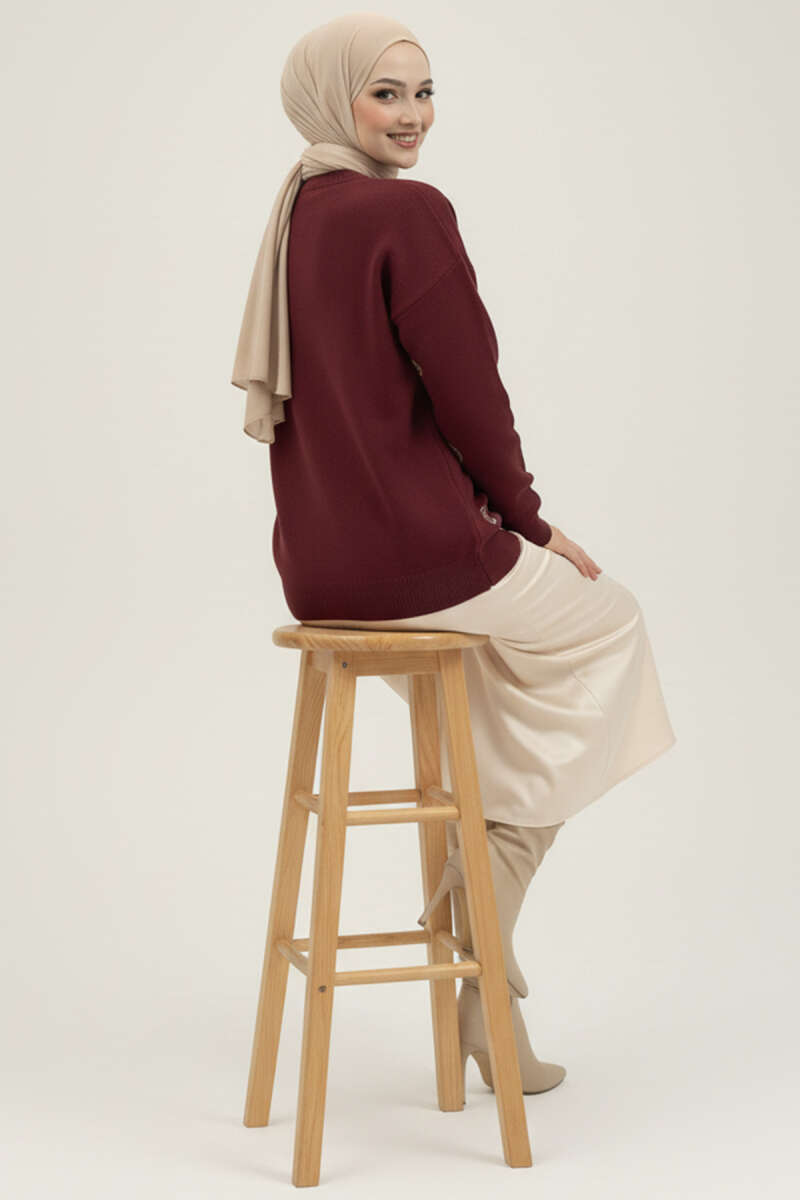 Leopar Desen Detaylı Sakallı Kazak Bordo