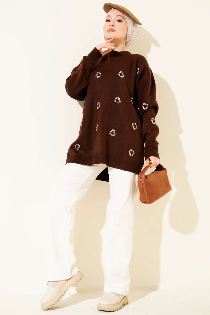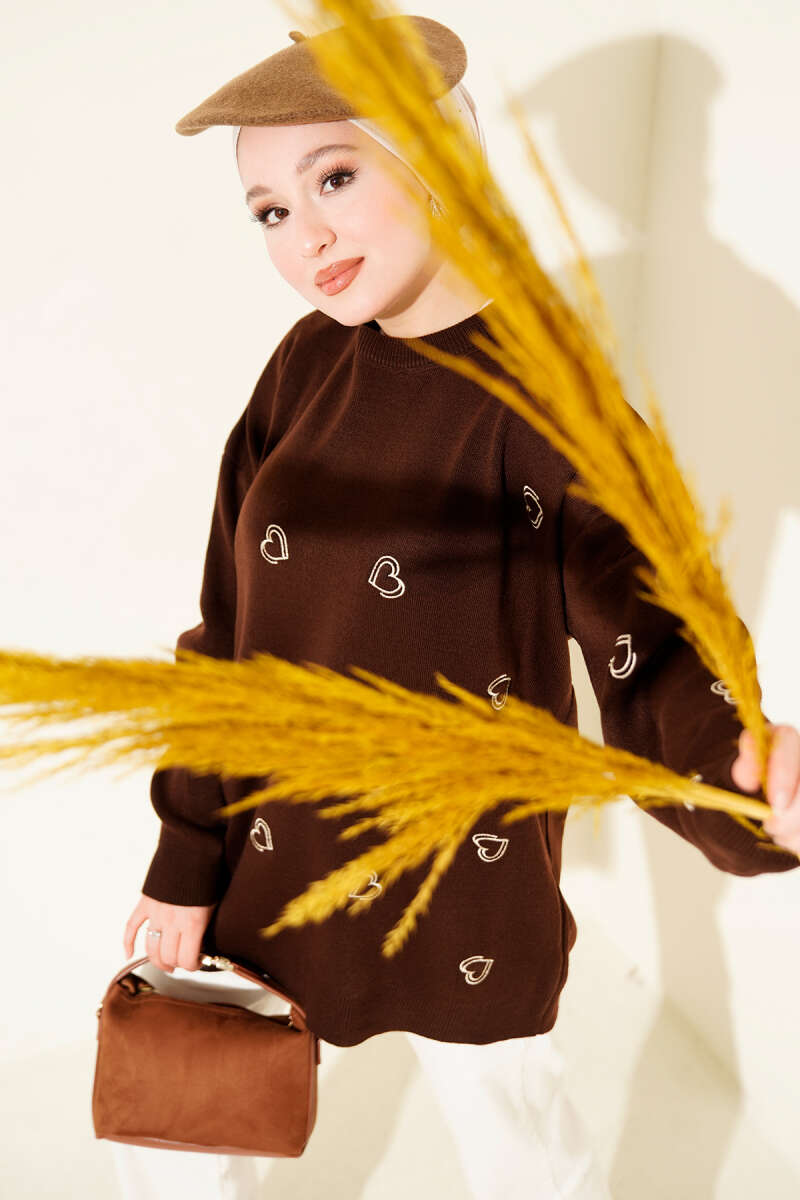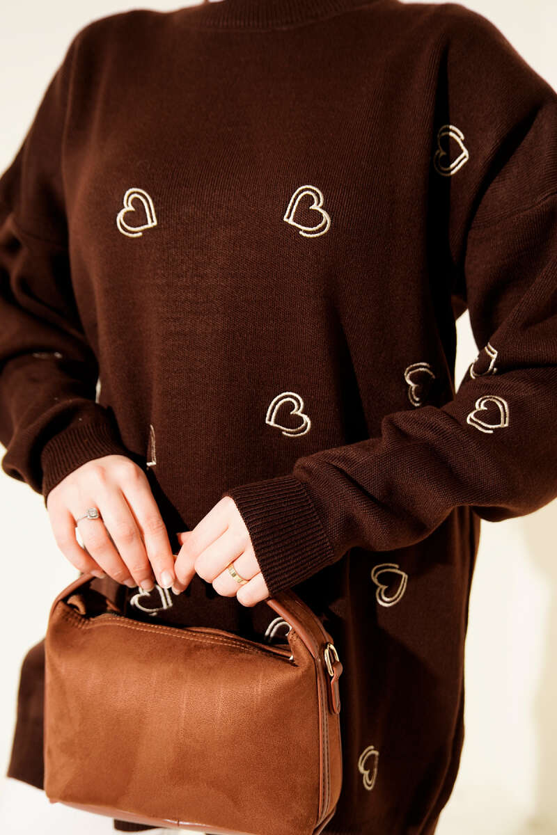 Kalp Nakışlı Triko Kazak Vizon