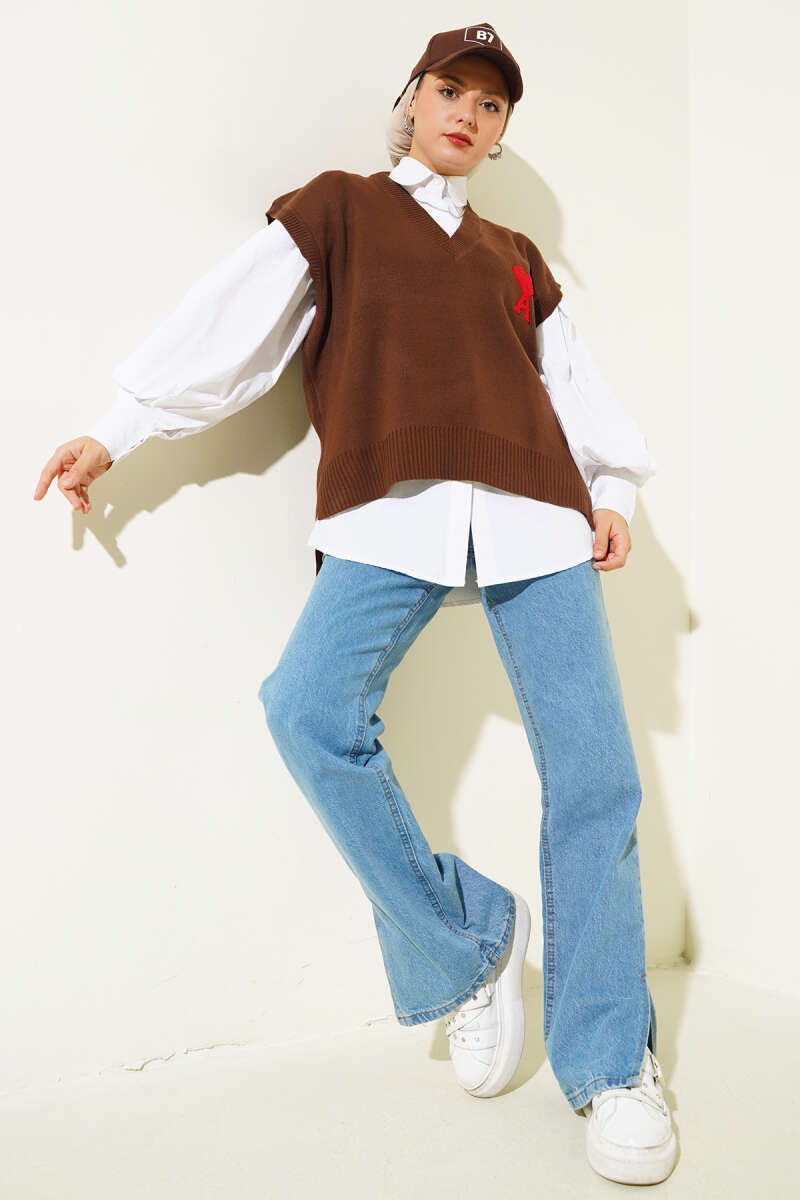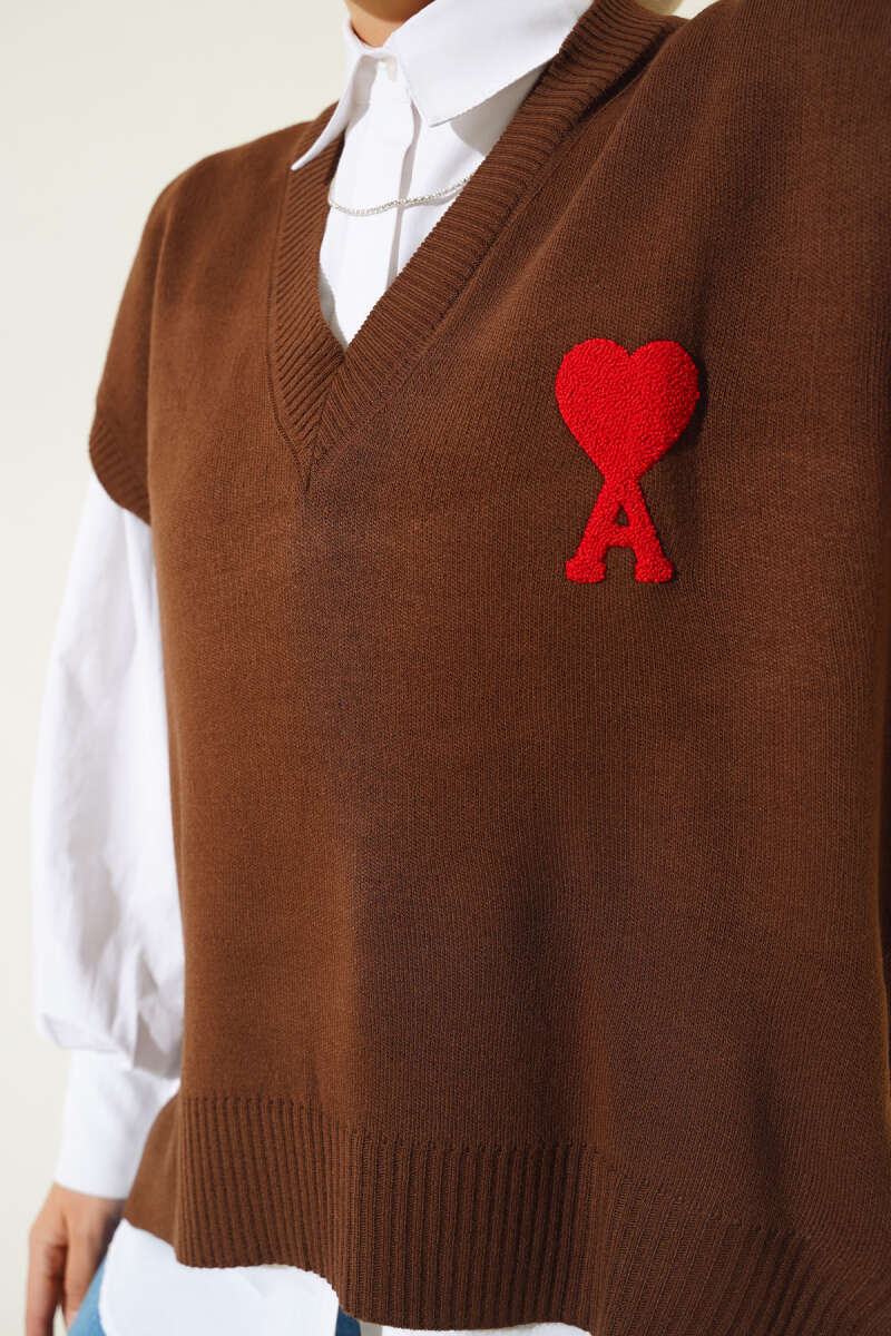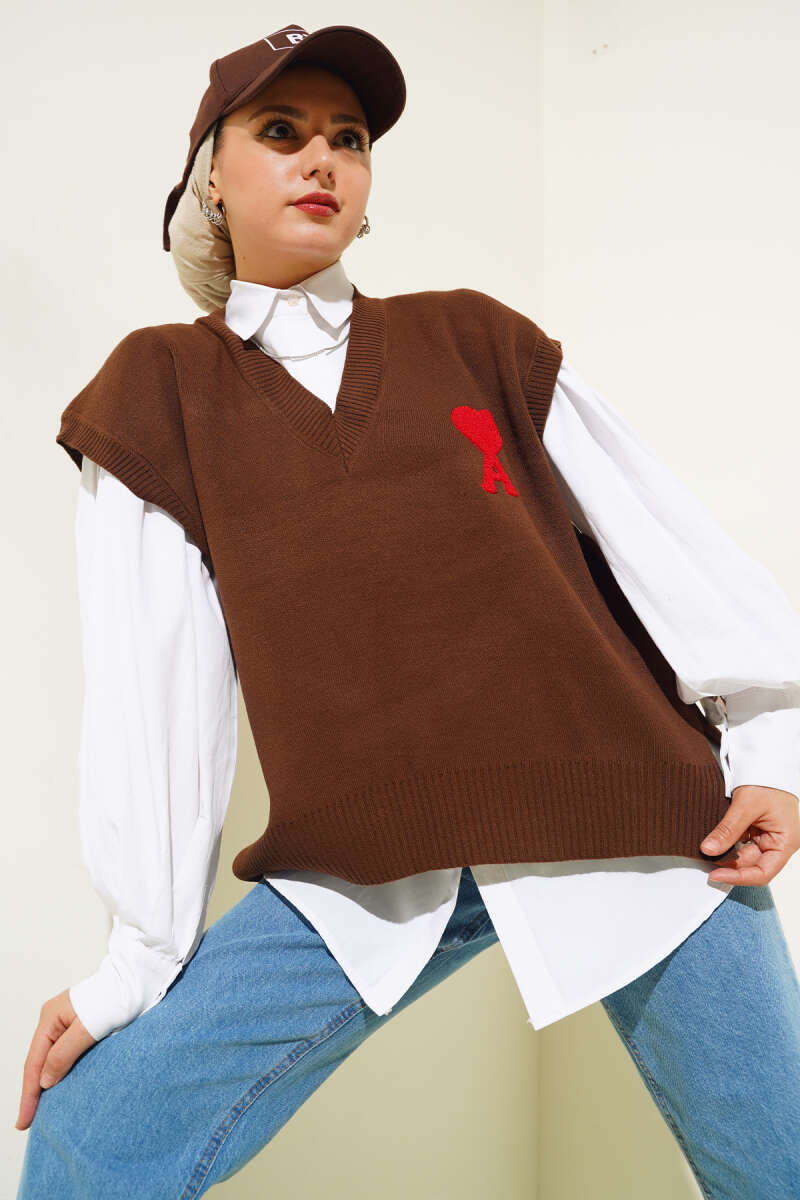 Kalp Nakışlı Triko Süveter Kahve