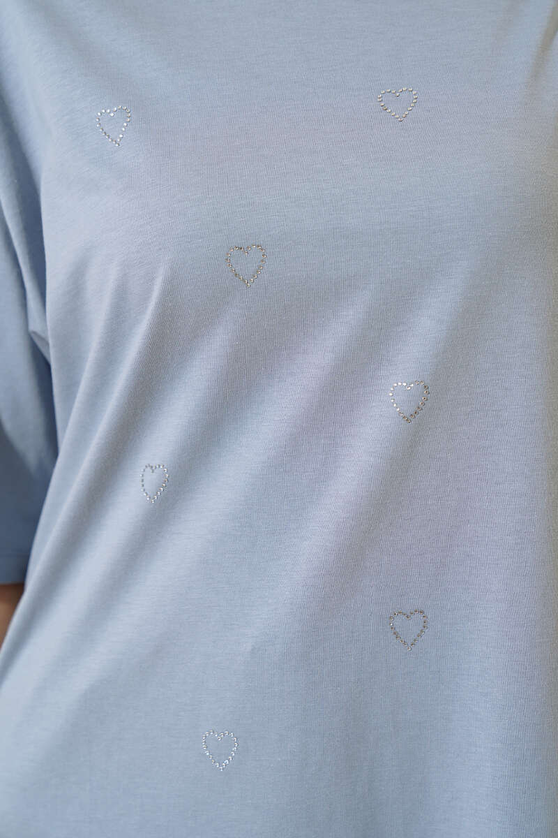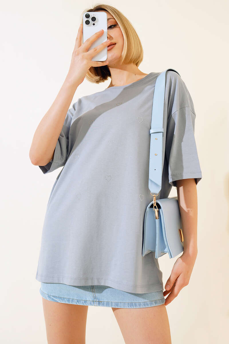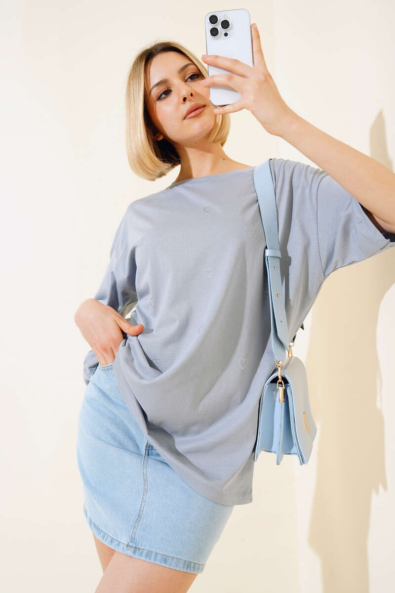 Yeni sezon t-shirt modelimiz sizlerle beraber. T-shirtümüz önü taşlı kalplerle süslenmiştir. Düşük omuzludur. Kısa kolludur. Salaş modeldir. Sade ve sportif t-shirt modelimiz kombinlerinize çok yakışacak. Renk seçeneklerimiz mevcuttur.