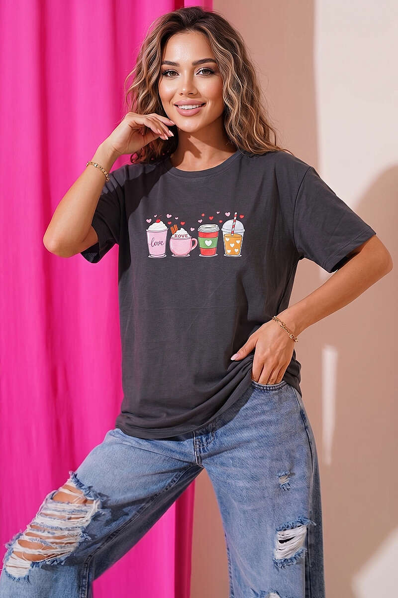 Kalpli Bardak Baskılı T-shirt Füme