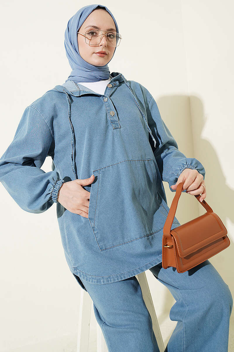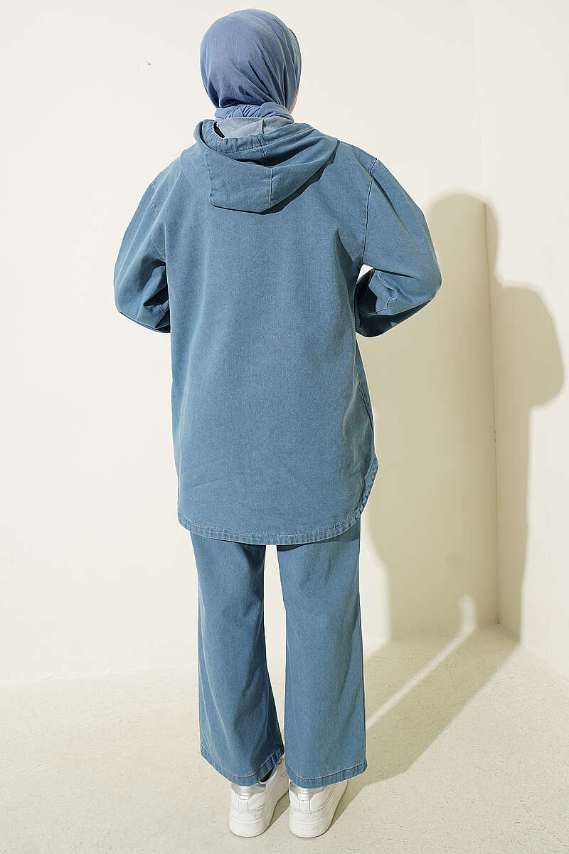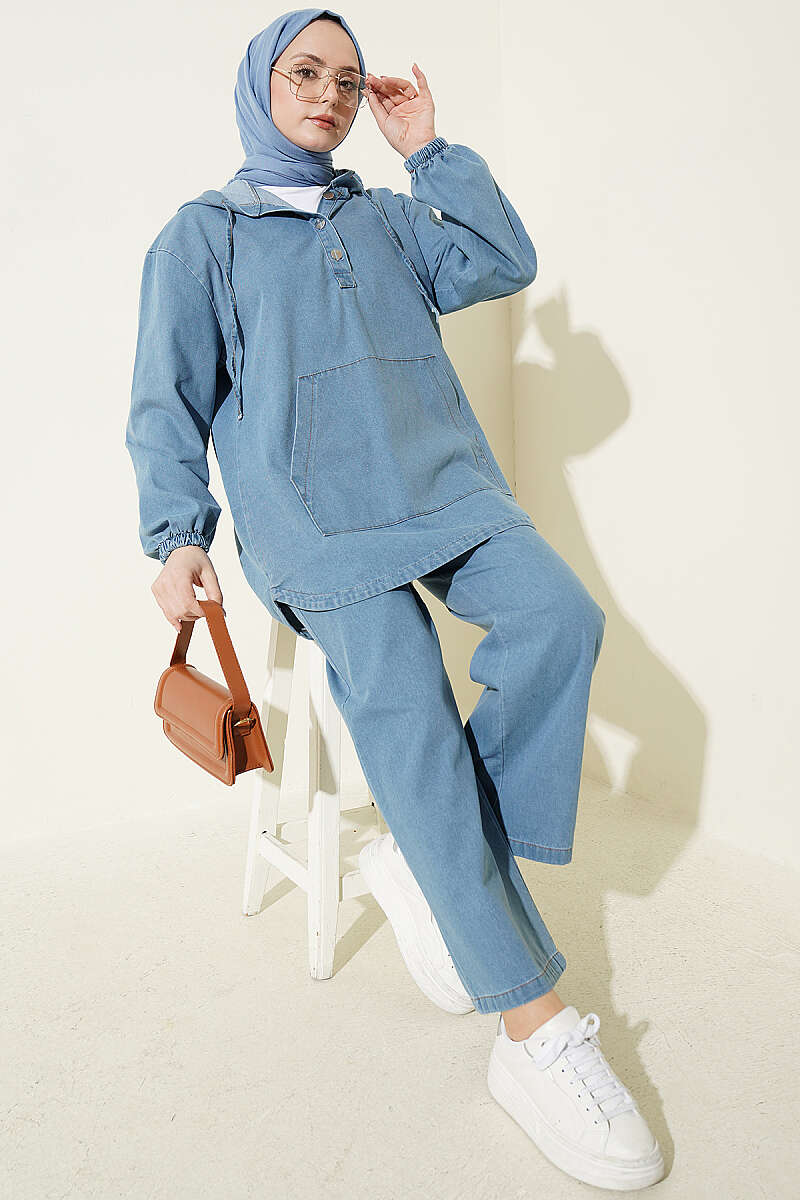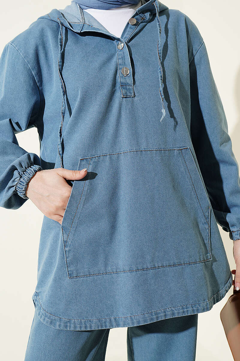 Kanguru Cepli Kapüşonlu Kot İkili Takım Açık Mavi
