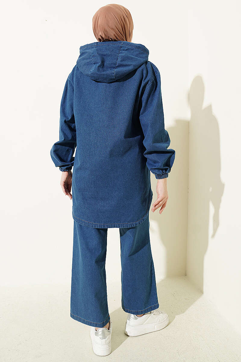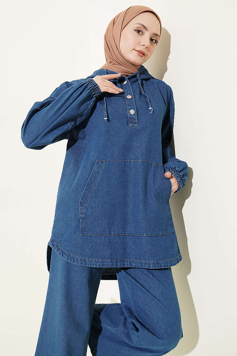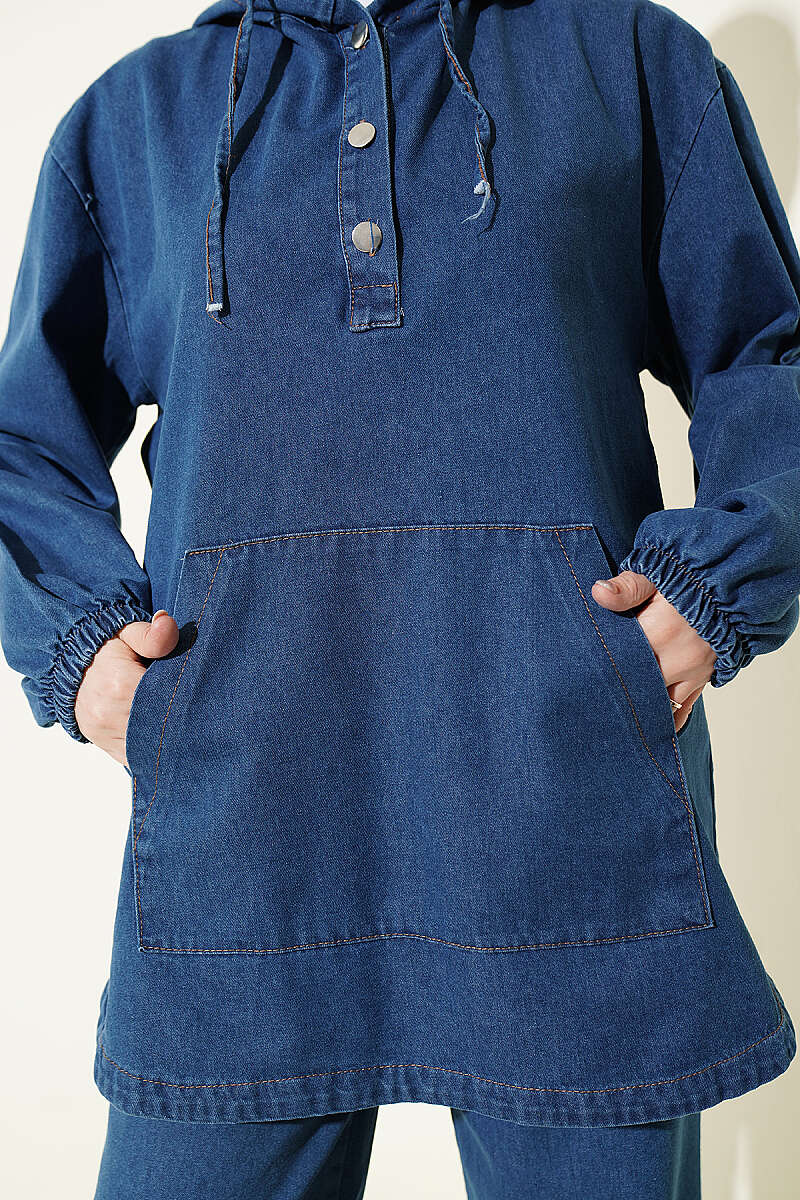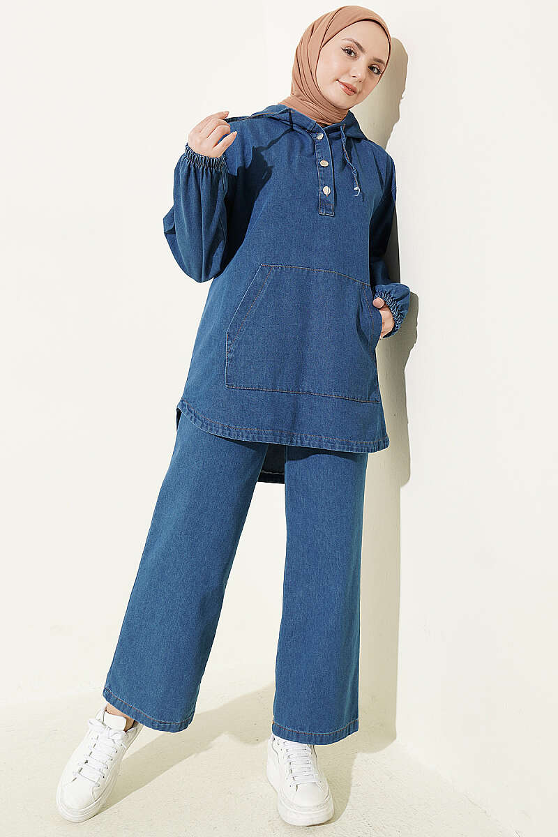 Kanguru Cepli Kapüşonlu Kot İkili Takım Mavi