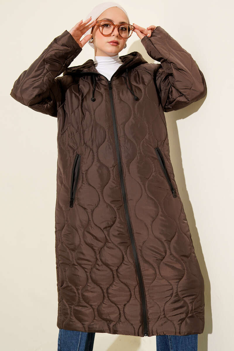 Kapitone Fermuarlı Kapüşonlu Mont Acı Kahve