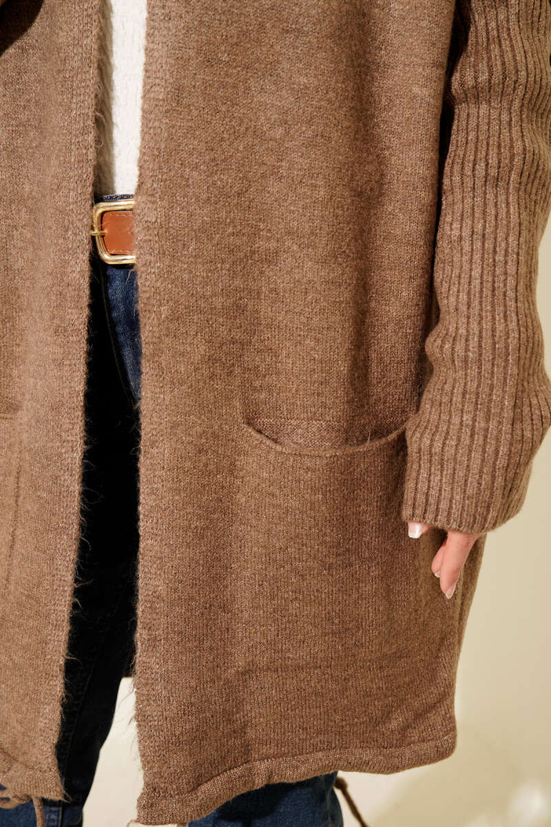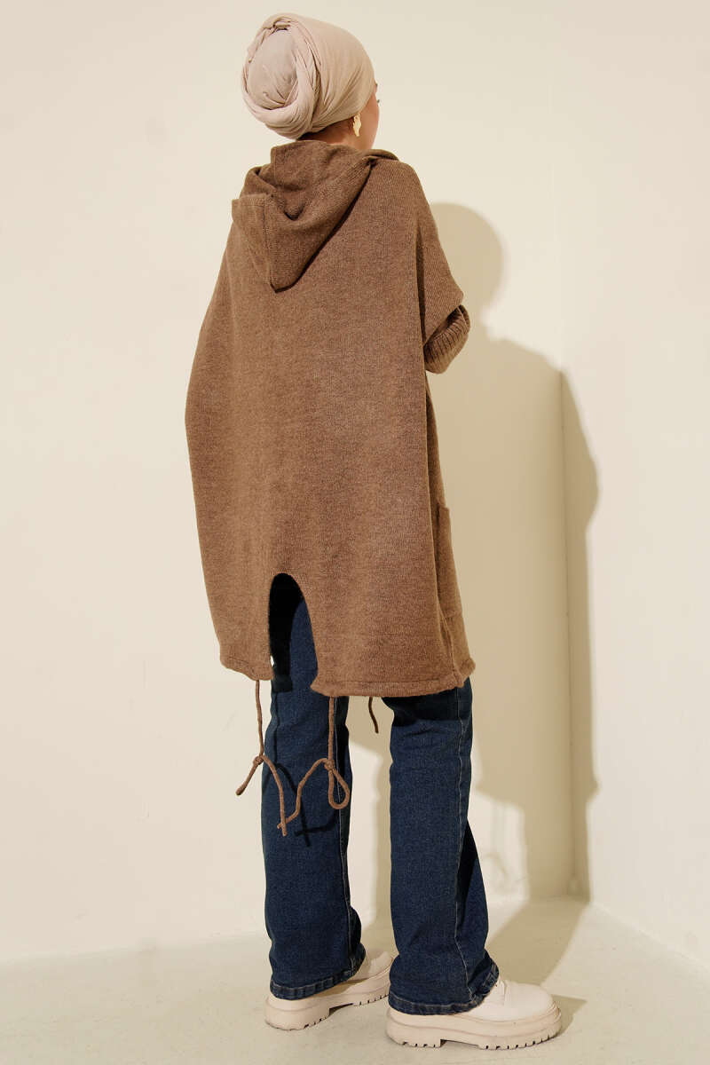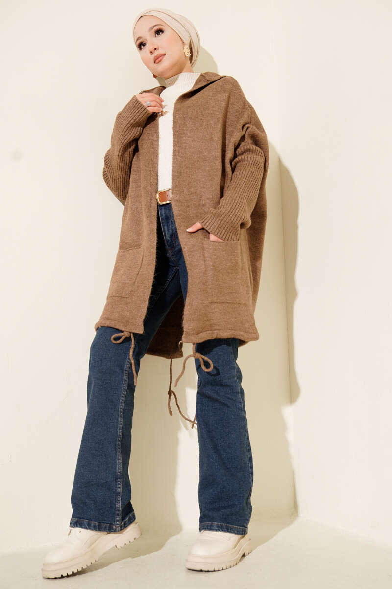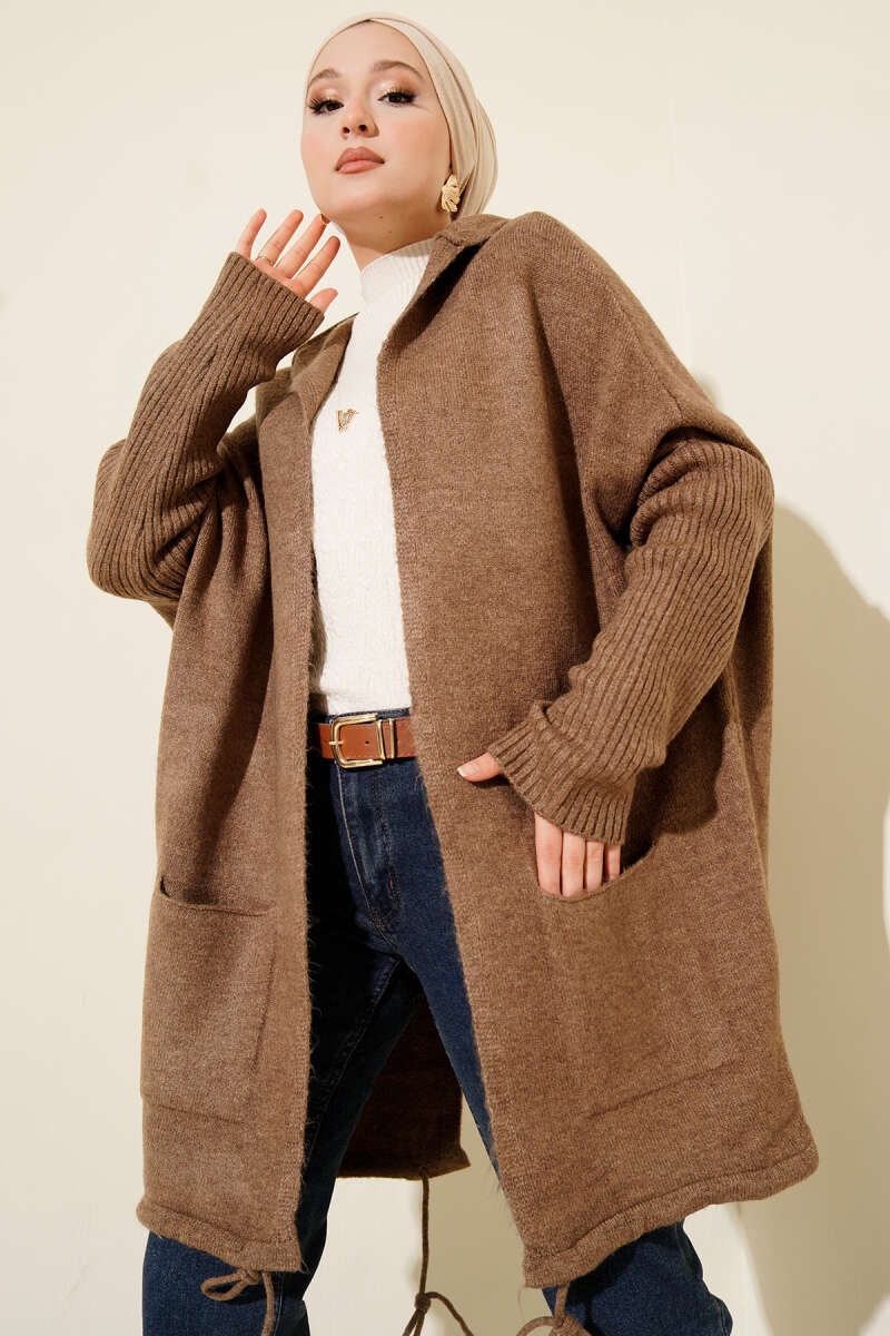 Kapşonlu Çift Cepli Triko Hırka Vizon