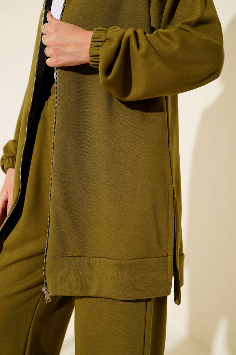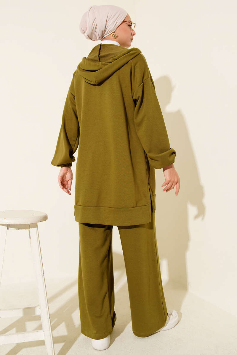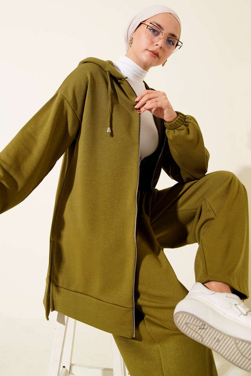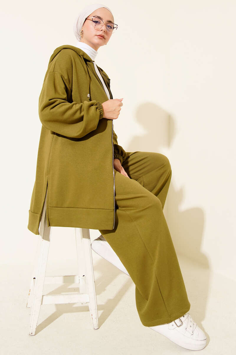Kapşonlu Fermuar Detaylı İkili Takım Yağ Yeşili