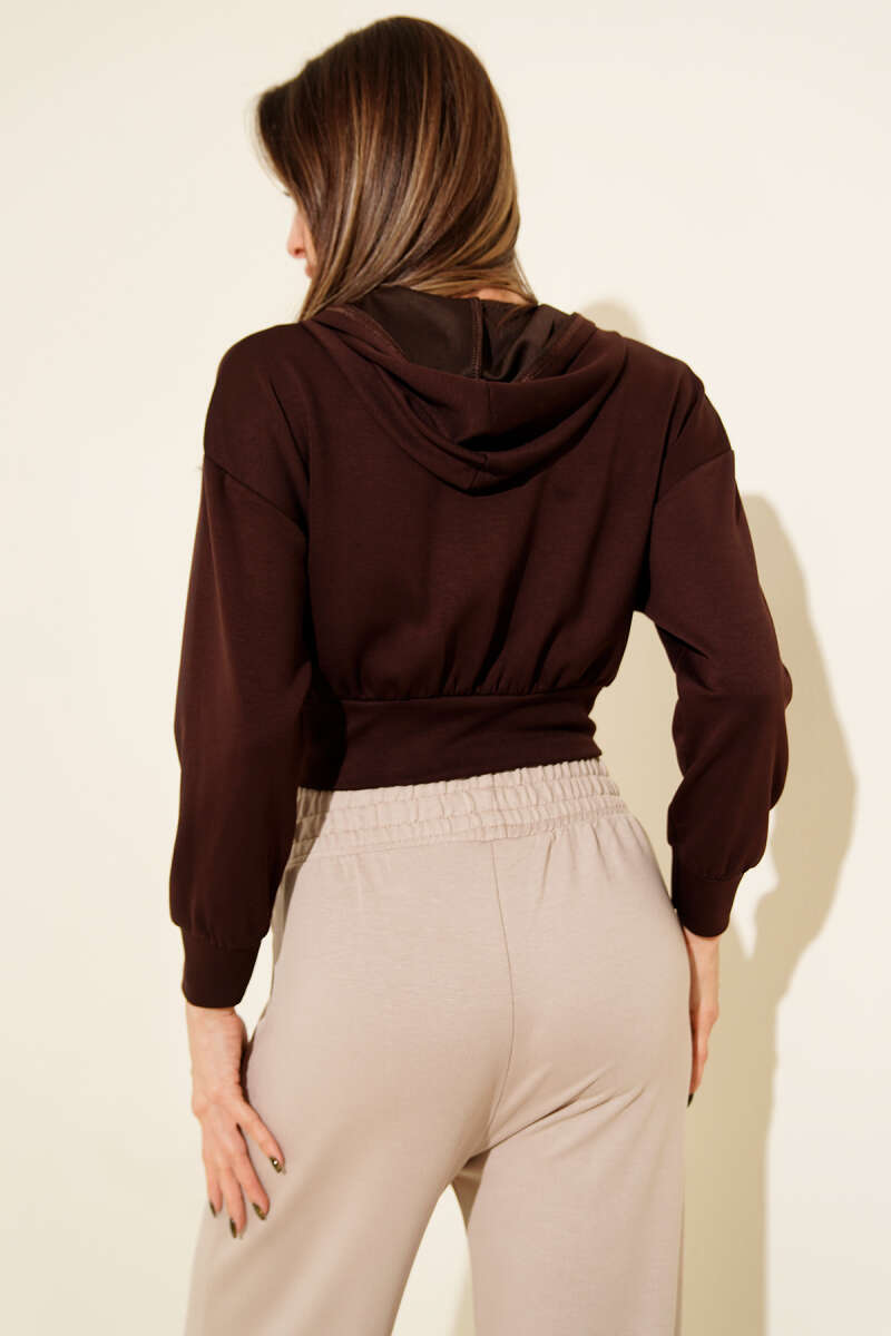Kapşonlu Fermuarlı Kısa Hırka Kahve